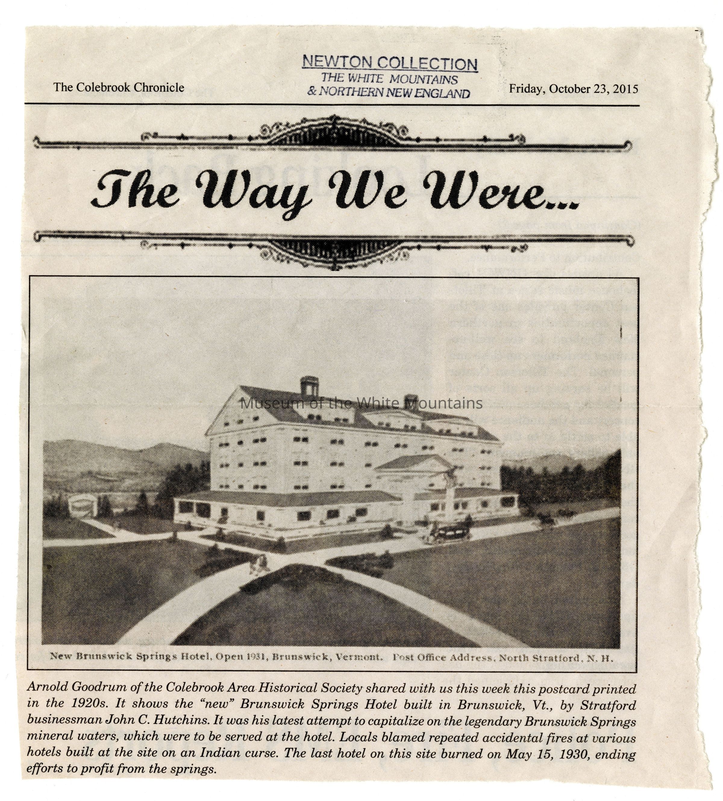 Part of an article in the Colebrook Chronicle. More specifically the picture of a postcard with a caption about the "new" Brunswick Springs Hotel.