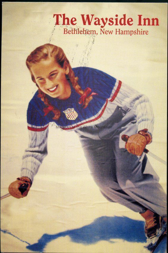 A color photo shows a young girl with two braids, tied with red ribbon, skiing down a slope with a smile. She is wearing a red, white and blue sweater with an emblem on the chest. The girl is also sporting brown gloves and ski poles. In the upper right hand corner, in red, "The Wayside Inn Bethlehem, New Hampshire" is printed on the card.Acquisition