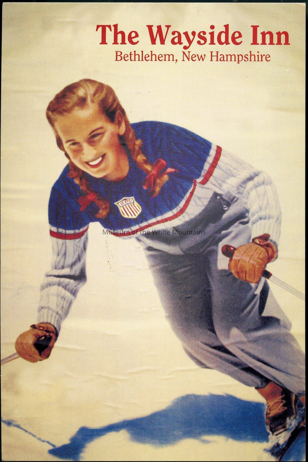 A color photo shows a young girl with two braids, tied with red ribbon, skiing down a slope with a smile. She is wearing a red, white and blue sweater with an emblem on the chest. The girl is also sporting brown gloves and ski poles. In the upper right hand corner, in red, "The Wayside Inn Bethlehem, New Hampshire" is printed on the card.Acquisition