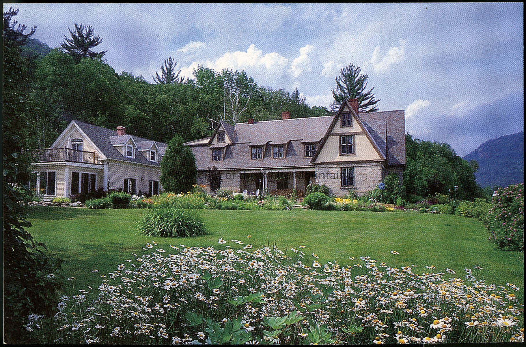A color photo of the Notchland Inn shows a beuatiful two story brown house shaped like an 'L'. The left side of the building is lighter in color and has a deck on the second floor and sunroom on the first. In front of the inn is a large flowers garden, extending around the yard. A mountainside is seen in the back as well as trees.
