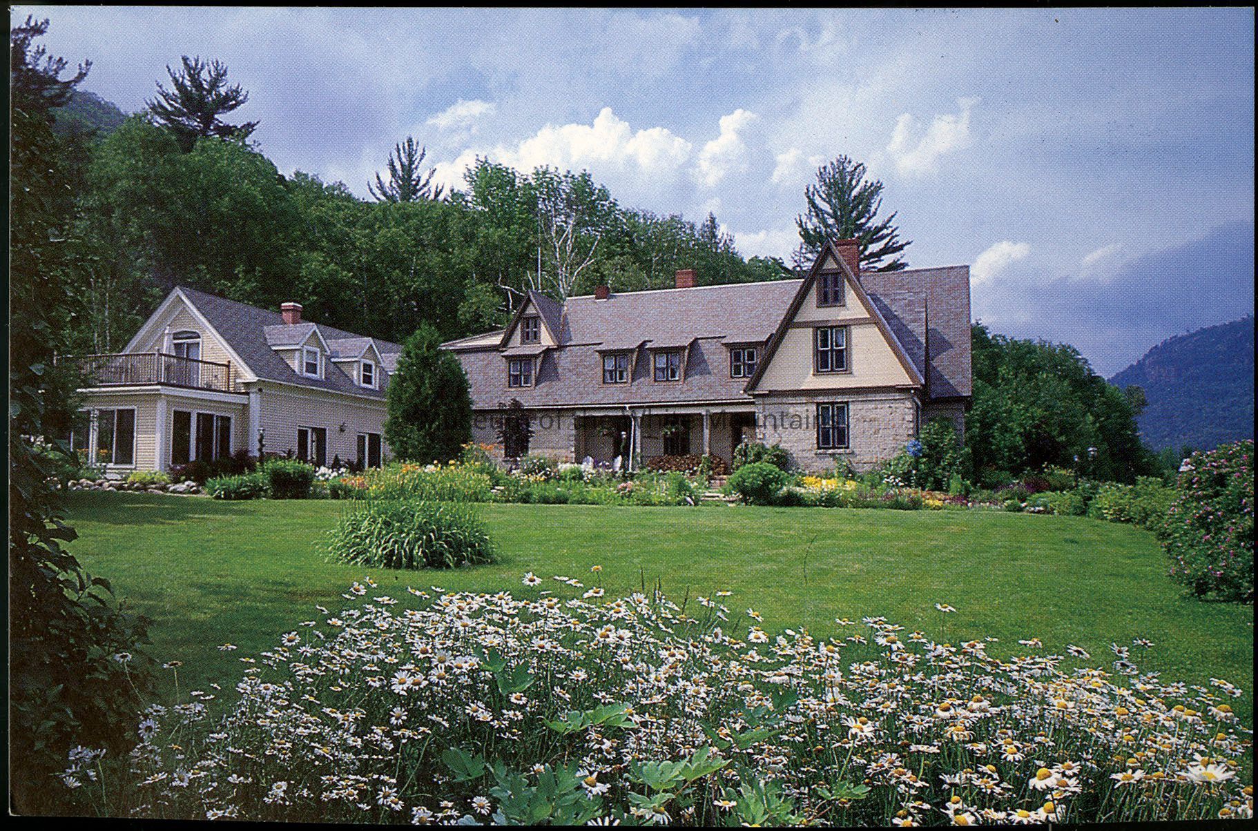 A color photo of the Notchland Inn shows a beuatiful two story brown house shaped like an 'L'. The left side of the building is lighter in color and has a deck on the second floor and sunroom on the first. In front of the inn is a large flowers garden, extending around the yard. A mountainside is seen in the back as well as trees.