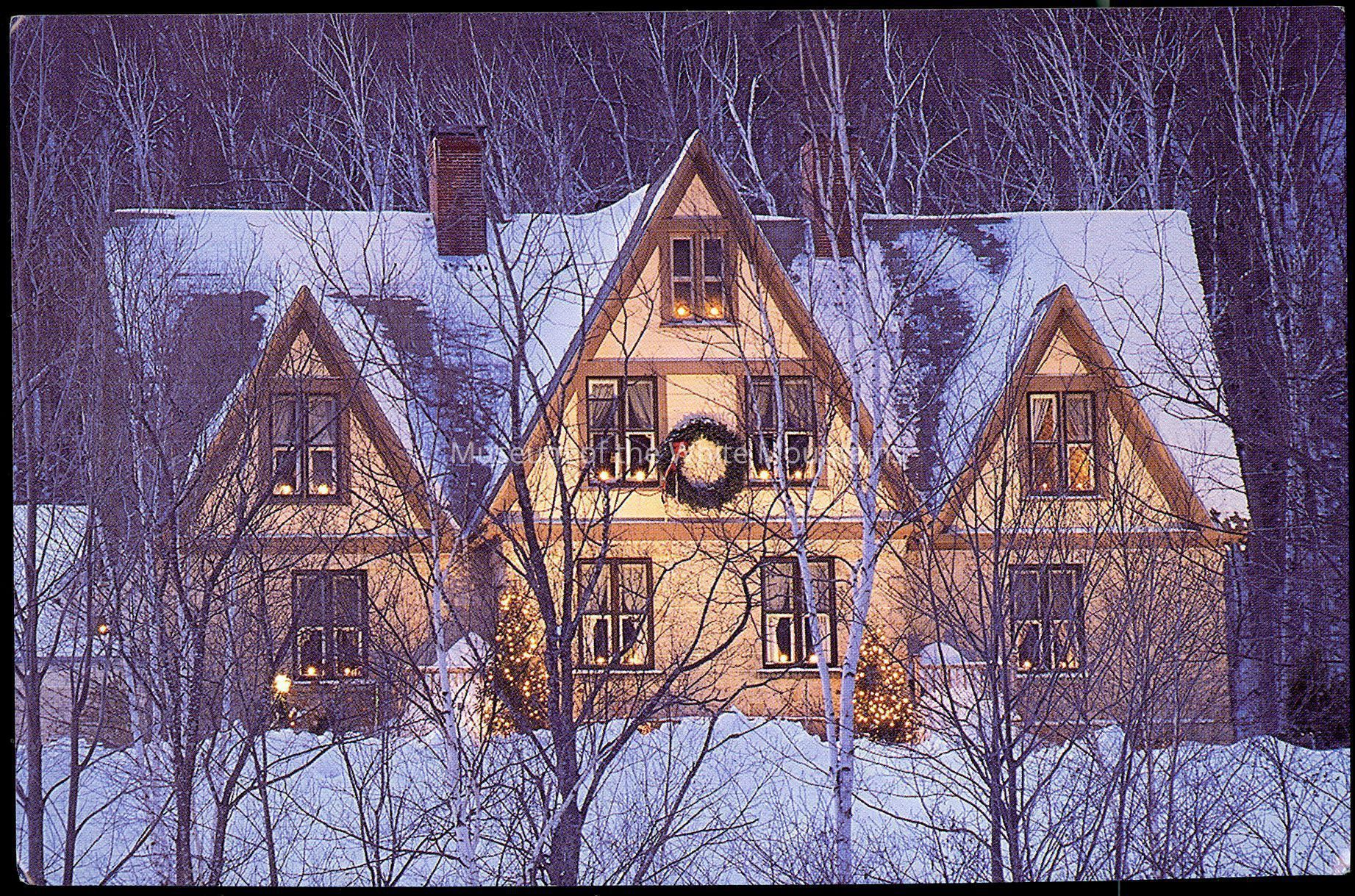 A color image of the Notchland Inn shows the side exterior with candles in the windows and a wreath in the middle. The trees at the base of the building are laden with christmas lights, glowing in the evening light. Snow covers the roof, lawn and surrounding trees.