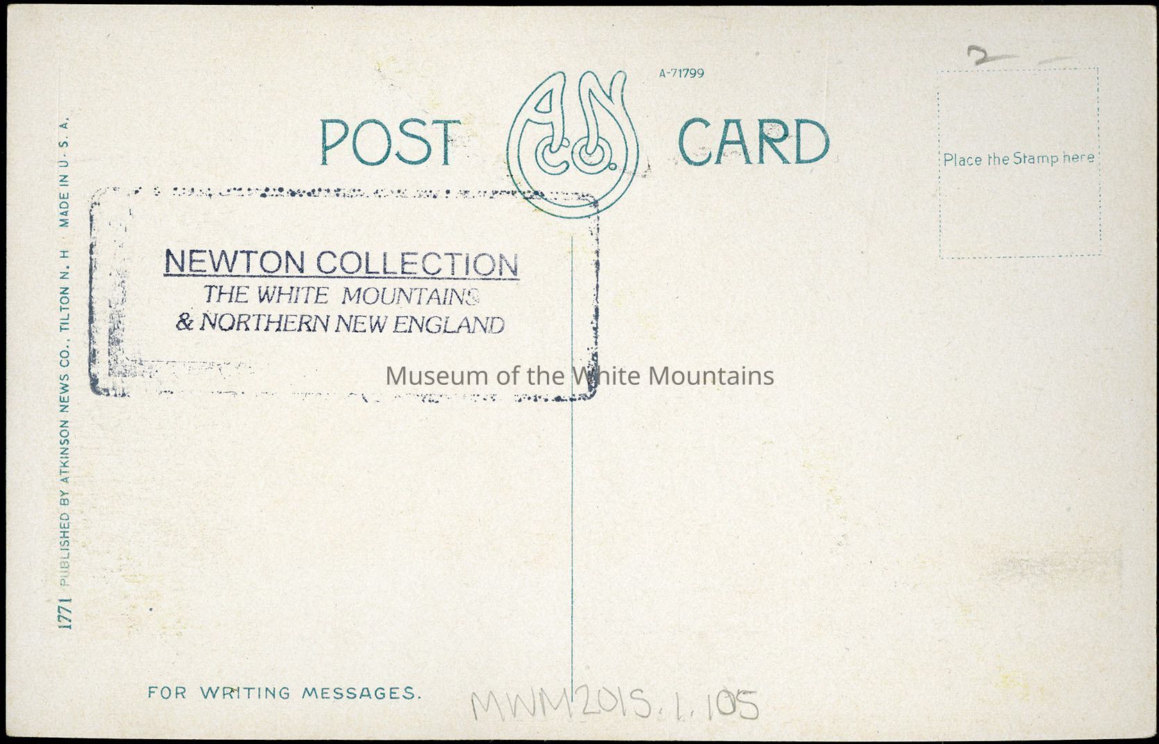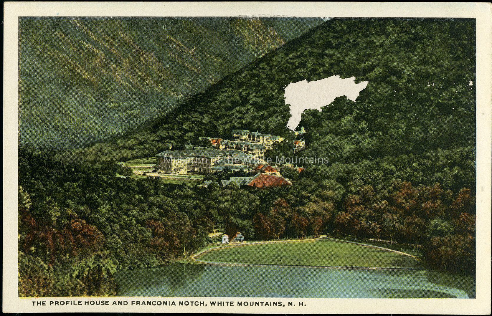 Colorized postcard shows the edge of a lake with the Profile House sitting just beyond in the Franconia Notch. Trees surround the property and extend up onto the mountain side in the background. A valley is also visible. The Profile House is a large estate made up of a large white hotel and smaller buildings behing it. The Profile house was built in 1852 and burned down in 1923. In 1928, the land was dedicated as the Franconia Notch State Park.