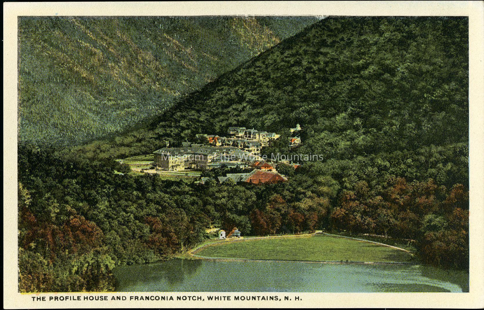 A color image shows the edge of a lake with the Profile House sitting just beyond in the Franconia Notch. Trees surround the property and extend up onto the mountain side in the background. A valley is also visible. The Profile House is a large estate made up of a large white hotel and smaller buildings behing it. The Profile house was built in 1852 and burned down in 1923. In 1928, the land was dedicated as the Franconia Notch State Park.