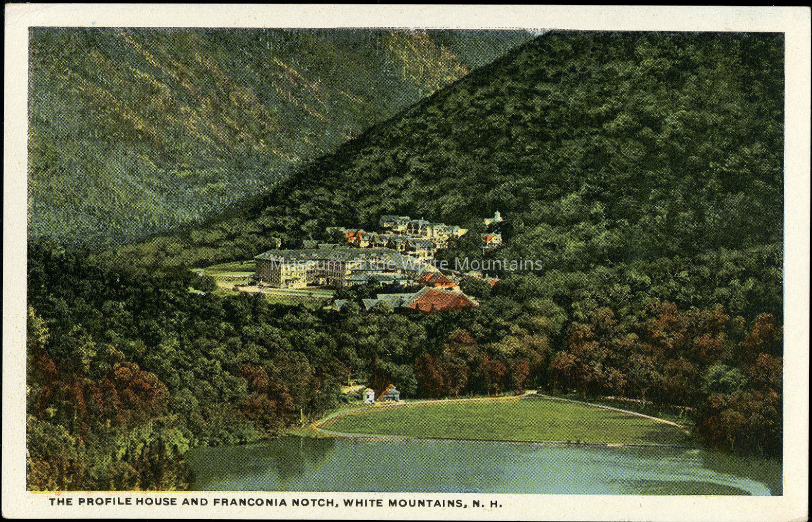 A color image shows the edge of a lake with the Profile House sitting just beyond in the Franconia Notch. Trees surround the property and extend up onto the mountain side in the background. A valley is also visible. The Profile House is a large estate made up of a large white hotel and smaller buildings behing it. The Profile house was built in 1852 and burned down in 1923. In 1928, the land was dedicated as the Franconia Notch State Park.