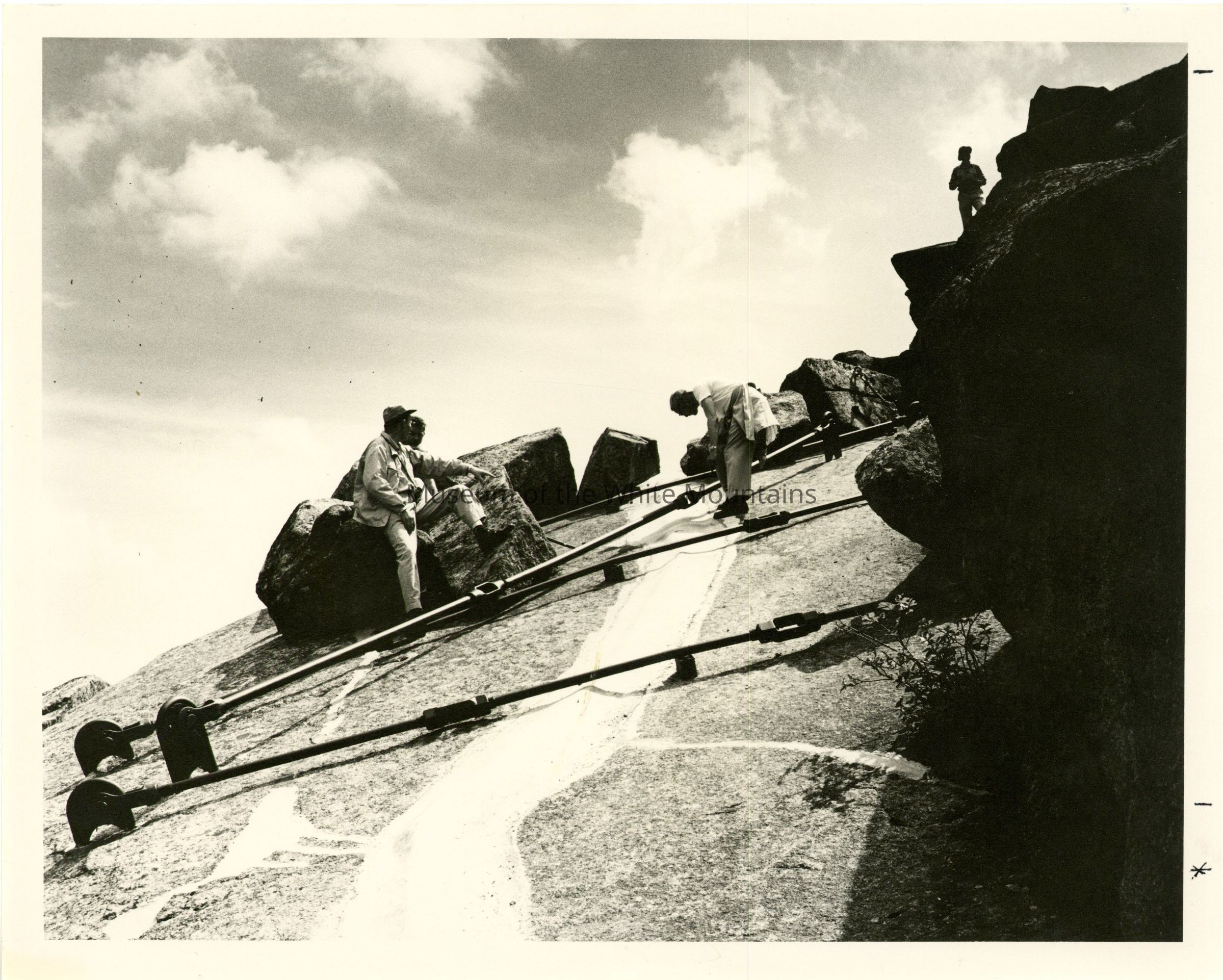 Three individuals inspect the turnbuckles holding the boulders in place for The Old Man of the mountain atop Cannon Cliff. Another individual is seen farther up the cliff.