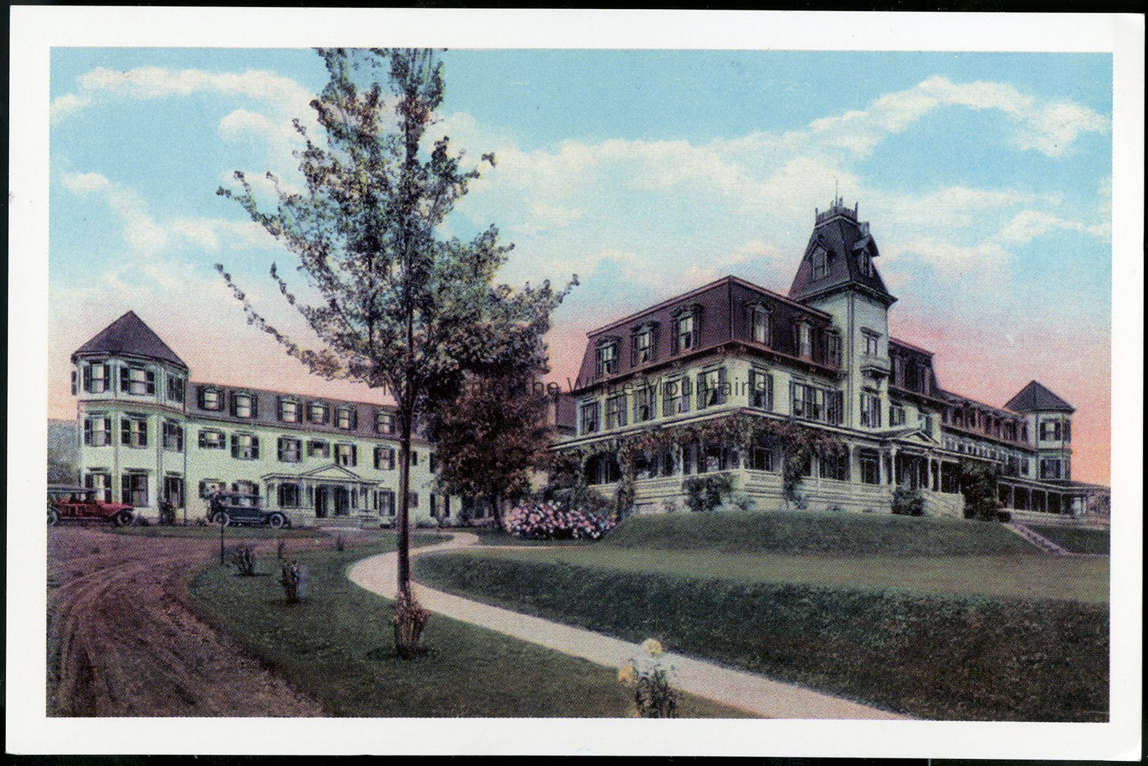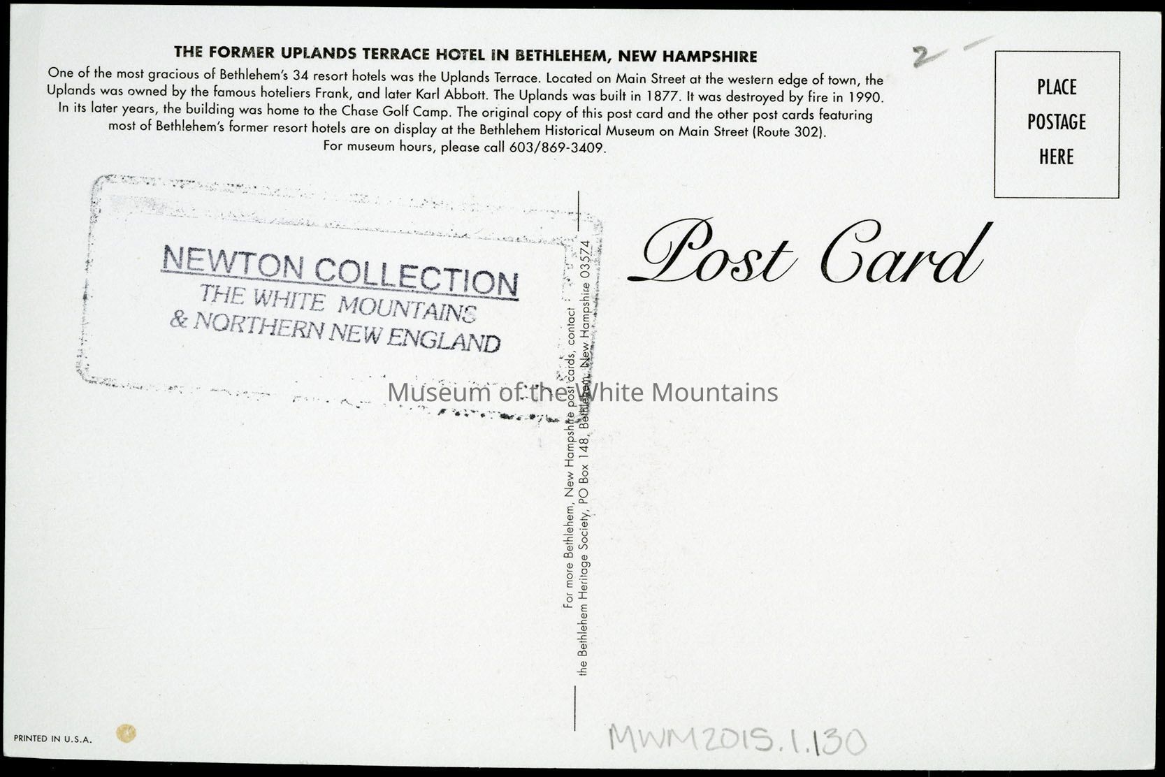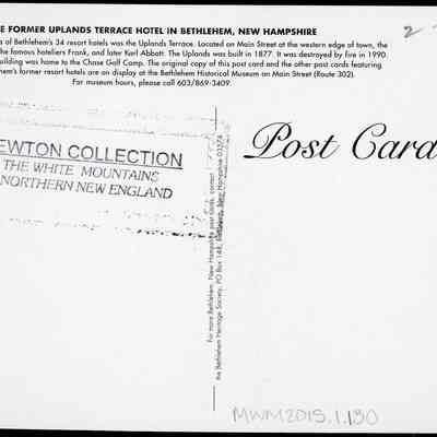 A color image shows the Uplands Terrace situated on a small hill. Automobiles sit to the left of the building. The hotel has a tower, two turrets and a mansard roof. A porch wraps around the main part of the building, with stairs leading up to the main door. A driveway allows cars to drive up and a lawn with flowers stretches out from the property.