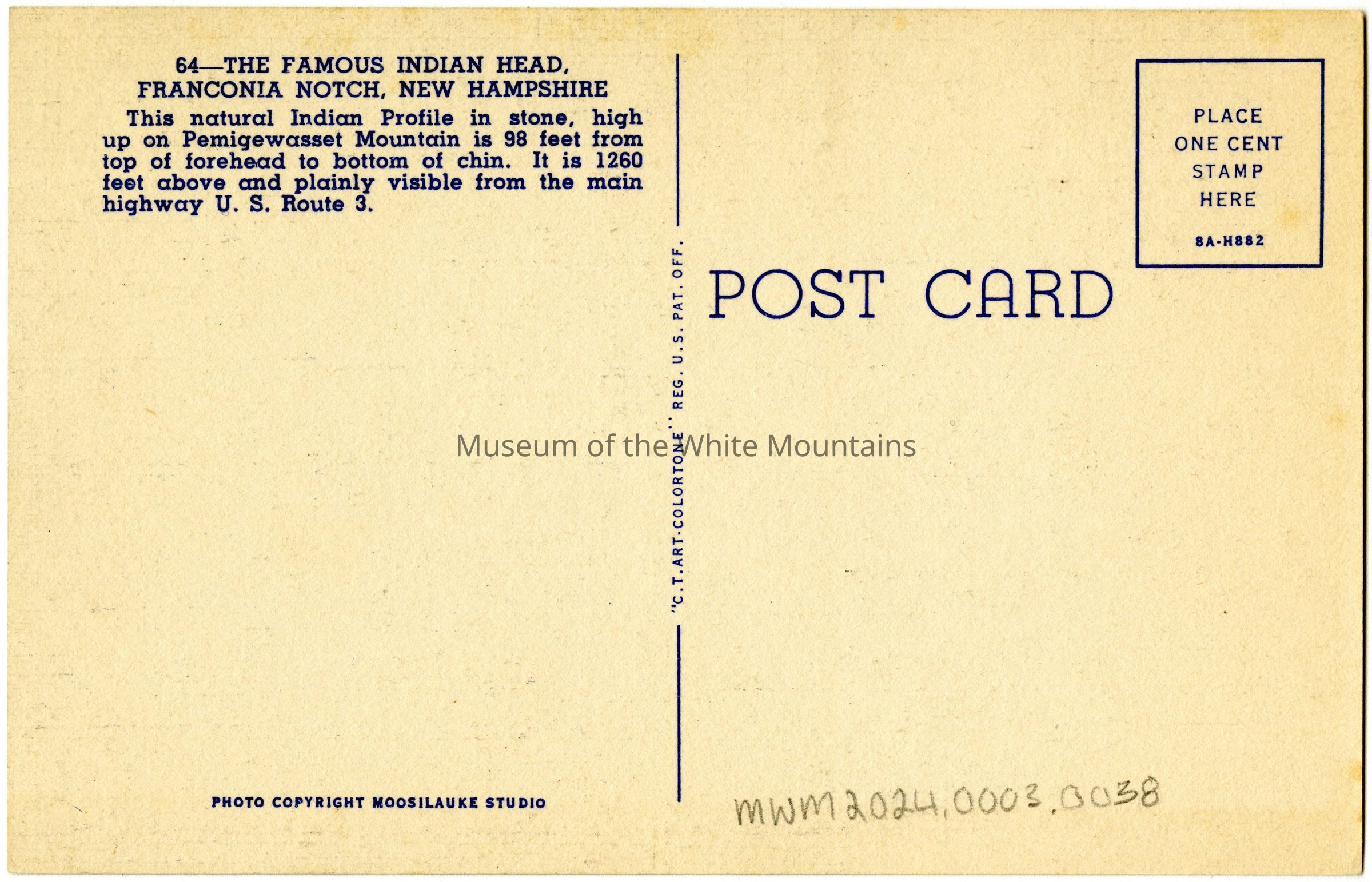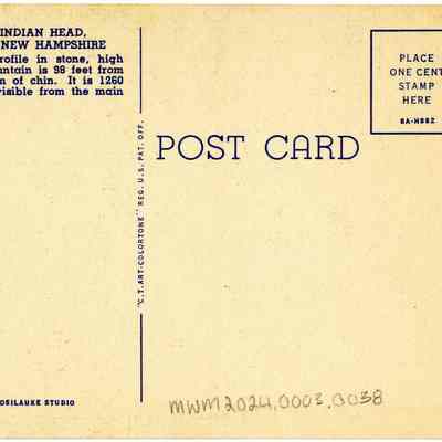 Divided postcard back without writing. Contains information about postcard subject: "64 - THE FAMOUS INDIAN HEAD, FRANCONIA NOTCH, NEW HAMPSHIRE / This natural Indian Profile in stone, high up on Pemigewasset Mountain is 98 feet from top of forehead to bottom of chin. It is 1260 feet above and plainly visible from the main highway U.S. Route 3.Subject