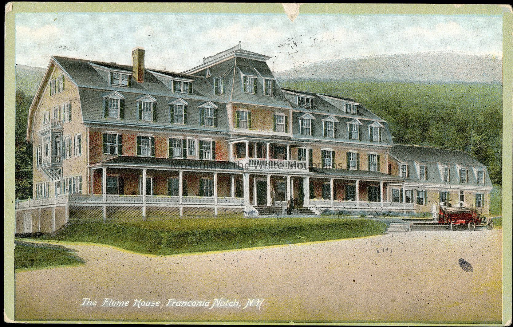 The Flume House in Franconia Notch dominates the image with a mansard roof, an elongated porch, a second story deck and dormers. It is a four story building with a two story section to the right. A carriage and people stand in front. Mountains are in the background.