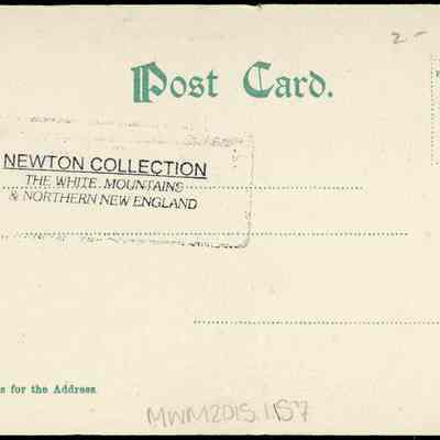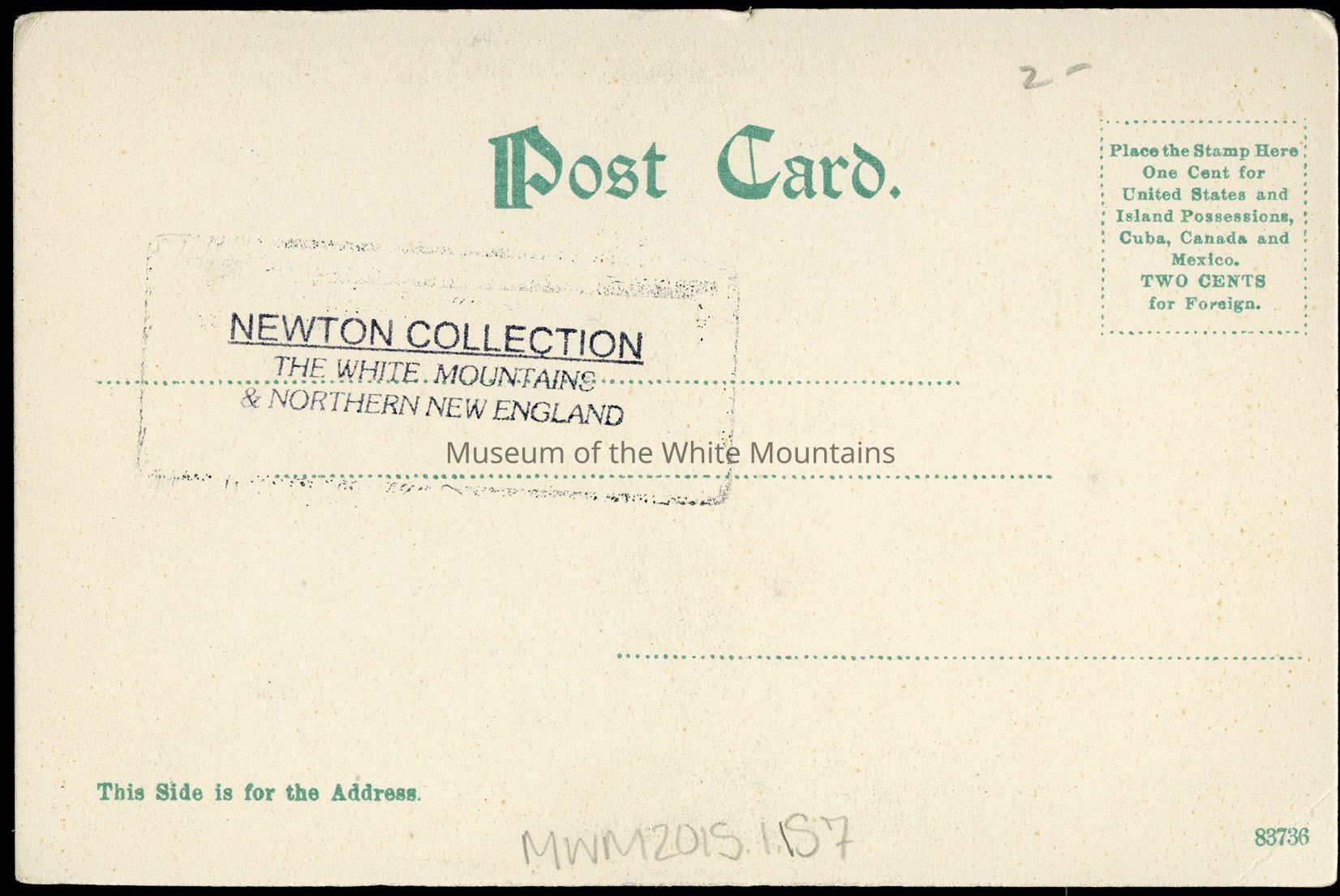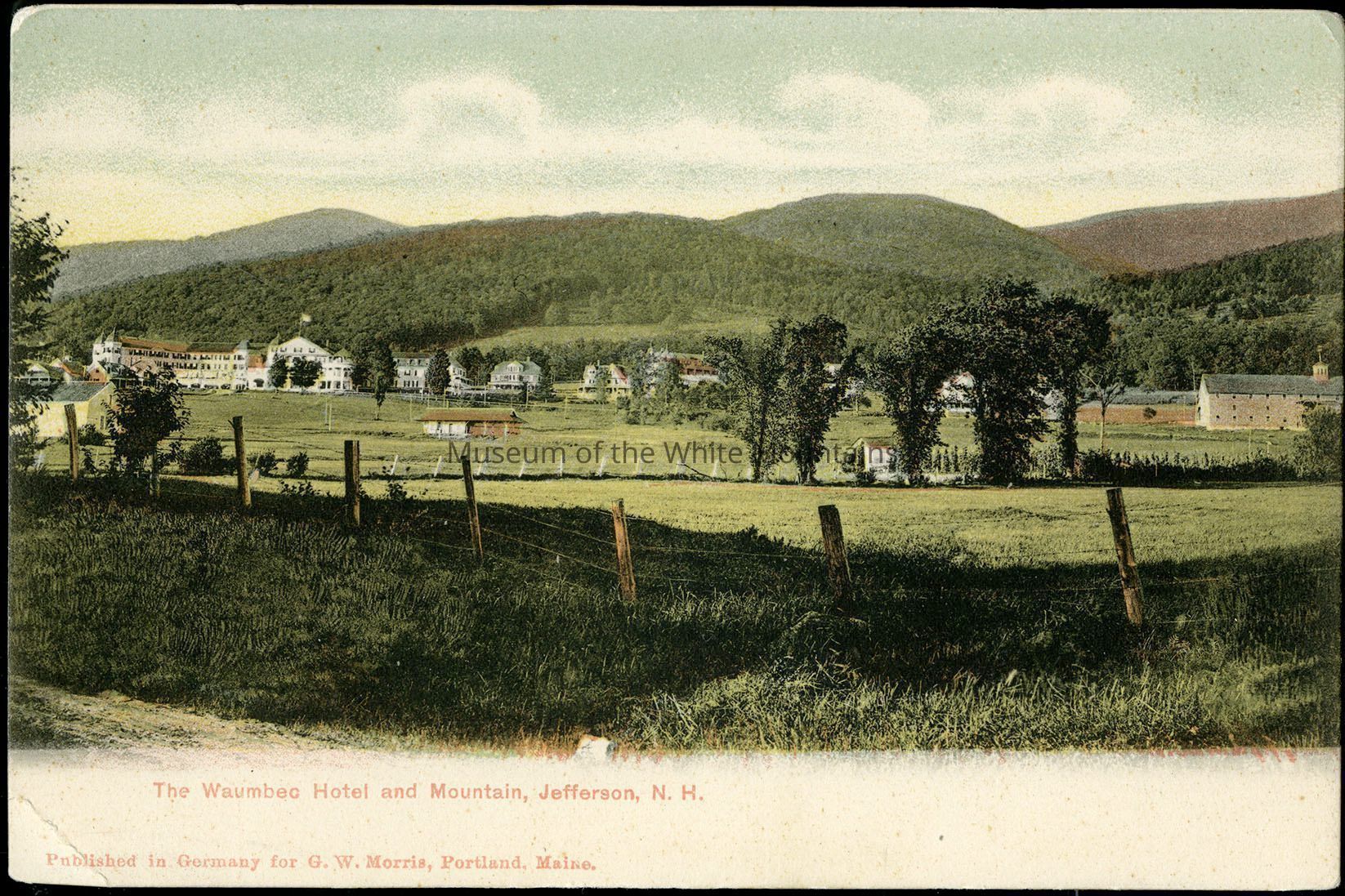 Fences line several fields in which houses, the Waumbec Hotel and other buildings are situated in the distance. In the background, are the mountains of the Pliney Range in Jefferson, New Hampshire. The sloping hills are covered in trees. Trees are scattered across the field. The Waumbec Hotel was built in 1860 and burned down in 1928. Published by the Hugh C. Leighton Co.Acquisition