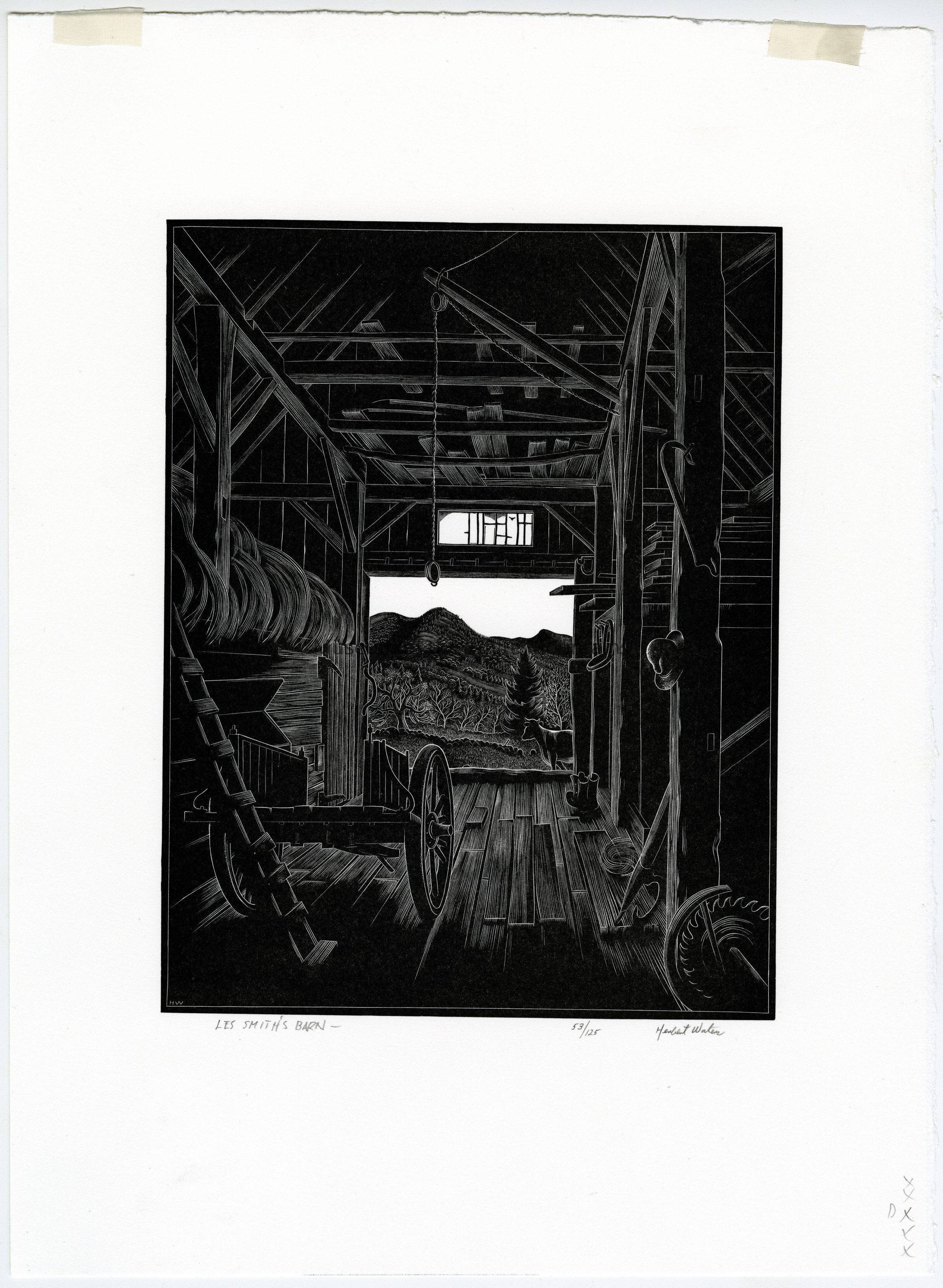 A print made by Herbert Waters titled 'Les Smith's Barn.' This print is number 53/125.