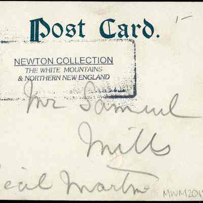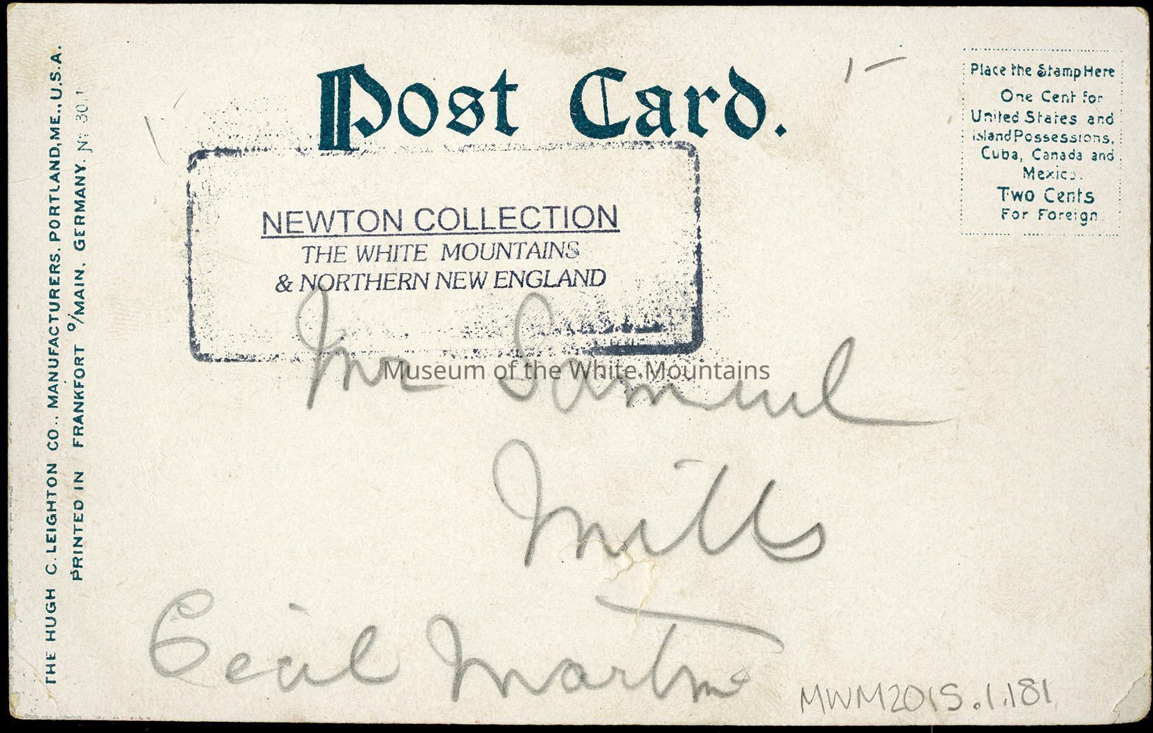 The Crawford House is visible, sitting in a valley surrounded by trees. Dirt roads stretch out from the house, through fields and train tracks run parallel to them. To the right is Saco Lake and in the background are mountains. Published by Hugh C. Leighton Co. Back Description: There is a name written on the back. Transcription: Mr. Samuel Mills Cecil Martin