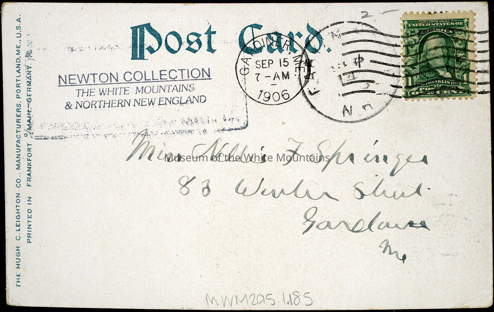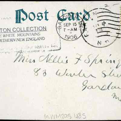 The Crawford House is visible, sitting in a valley surrounded by trees. Dirt roads stretch out from the house, through fields and train tracks run parallel to them. To the right is Saco Lake and in the background are mountains. Published by Hugh C. Leighton Co. Back Description: There is a name and address on the back of the card as well as a Benjamin Franklin stamp in the upper right corner. Transcription: Miss Nellie F Springer 83 Winter Street Gardiner, Me
