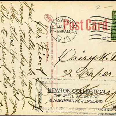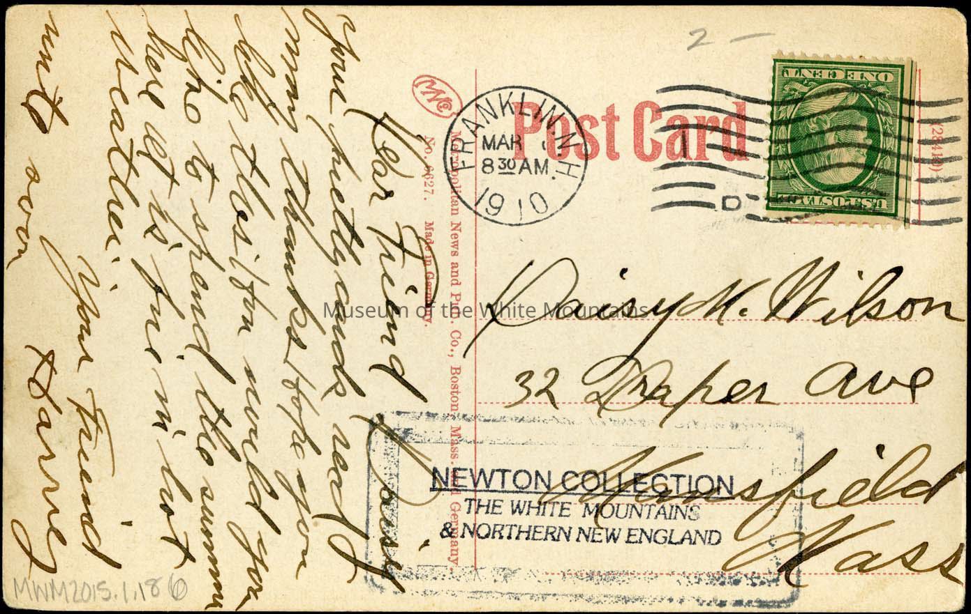 The Crawford House is visible, sitting in a valley surrounded by trees. Dirt roads stretch out from the house, through fields and train tracks run parallel to them. To the right is Saco Lake and in the background are mountains. Published by Metropolitan News and Pub, Co. Back Description: There is an address and letter on the back of the card as well as a Benjamin Franklin stamp in the upper right corner. Transcription: Daisy M. Wilson 32 Draper Ave Mansfield, Mass Dear Friend Daisy Your pretty cards rec'd many thanks Hope you like this Hon would you like to spend the summer here it is fine n' hot weather. Write soon Your Friend Harry