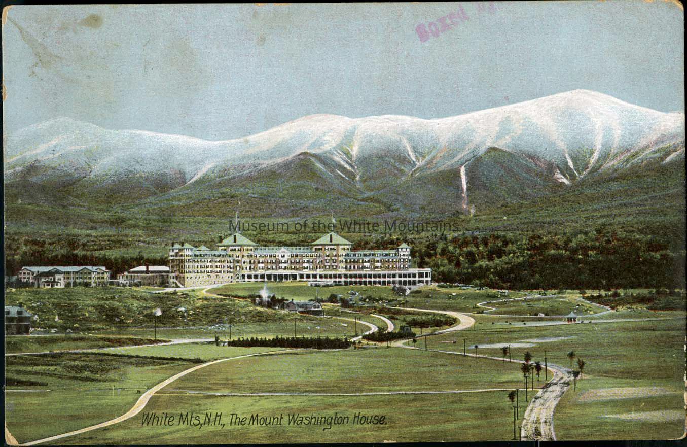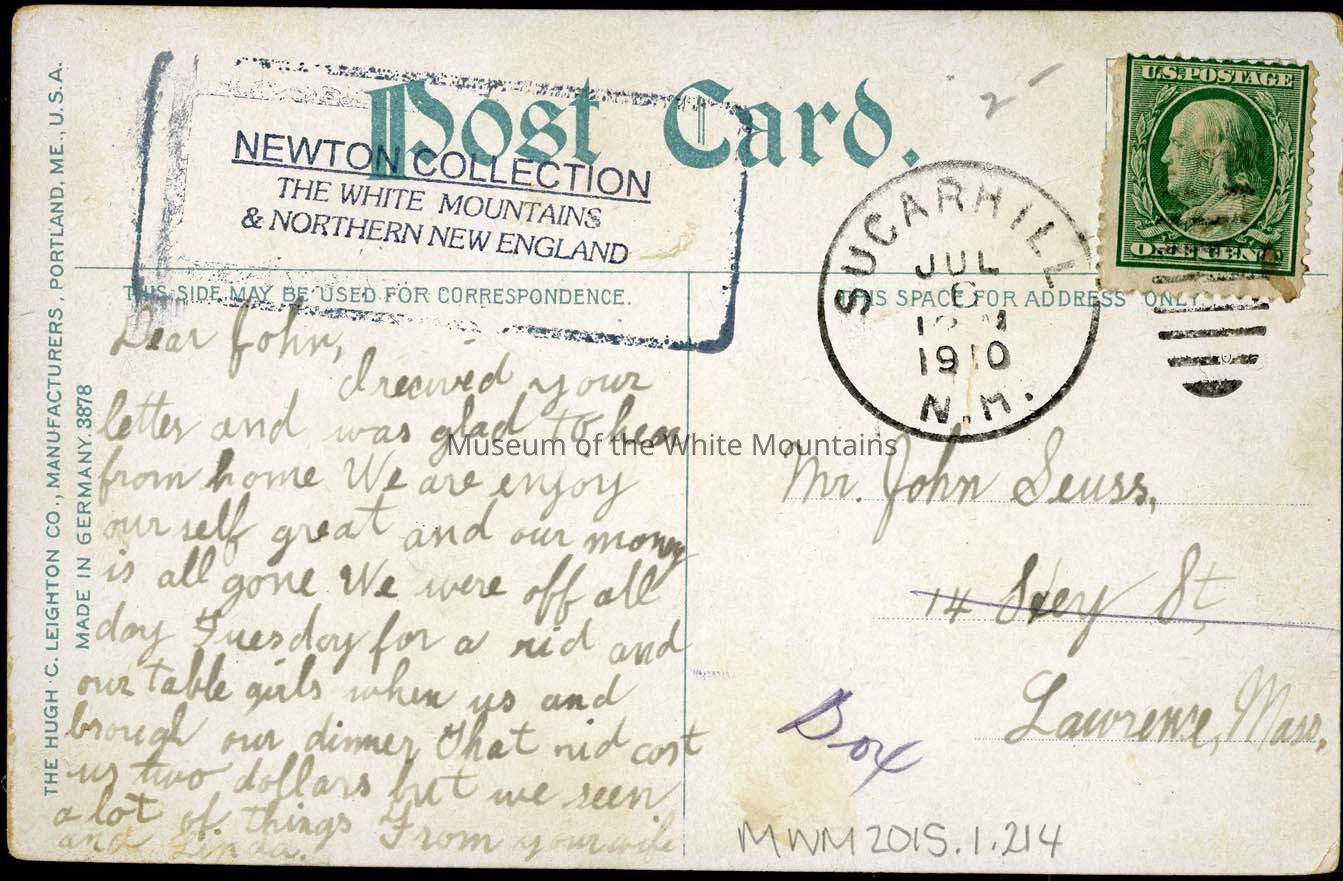 The Mount Washington Hotel sits in the midground at the edge of a forest that conintues until the base of a snow-covered Mount Washington. The Hotel sports two octagonal towers with flags as well as four smaller towers on either side of the building. In the foreground are several buildings and houses as well as a series of dirt roads and fields. There are also several scattered trees. Published by the Hugh C. Leighton Co. Back Description: There is an address and letter written on the back as well as a Benjamin Franklin stamp in the upper right corner. Transcription: Mr. John Seuss 14 [indistinguishable] St., Lawrence, Mass Dear John, I received your letter and was glad to hear from home. We are enjoy ourself great and our money is all gone. We were off all day Tuesday for a rid and our table girls when us and brought our dinner that rid cost us two dollar but we seen a lot of things From your wife and Linda