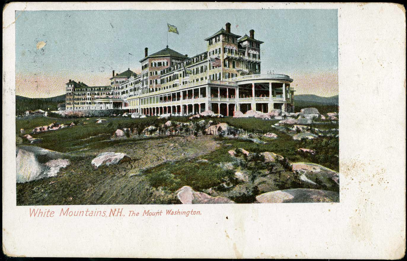 The Mount Washington Hotel is pictured with rocks scattered about the front lawn and mountains in the background. The hotel sports two octagonal towers with flags as well as four towers, two on each side of the building, a porch, deck, veranda and a porte cochere. People line the railing of the veranda and a few stand above on the deck. Published by the Hugh C. Leighton Co.