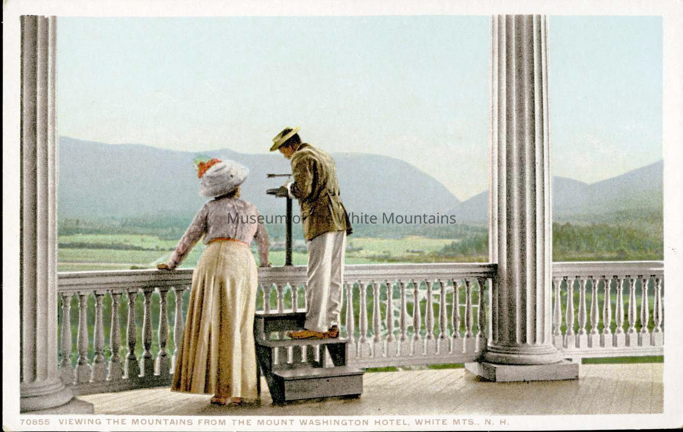 A man looks to be using some sort of telescope to view the mountains in the distance while a woman, dressed in a blouse and skirt, leans on the banister and watches him. The hotel sports a veranda with large white pillars, which are visible in the image. In the distance, are the White Mountains. Published by the Detroit Publishing Company.Acquisition
