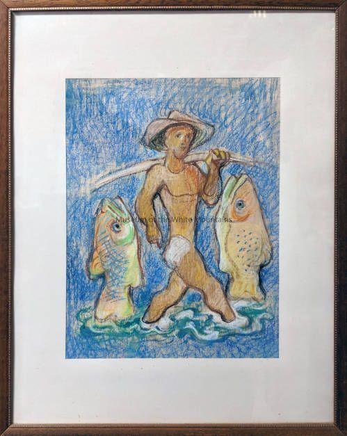 Framed pastel drawing of a man carrying two fish on a pole. Undated.Acquisition