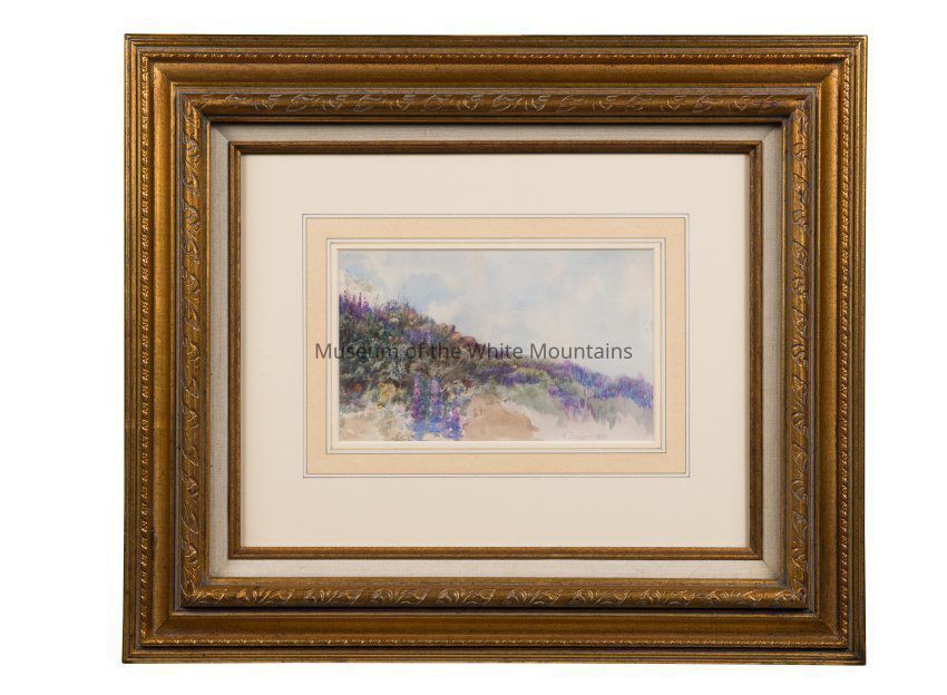 Watercolor painting of lupine flower field, with a few other flowers, grass, and rocks. Landscape gradually slopes from upper left to lower right.Artwork Details