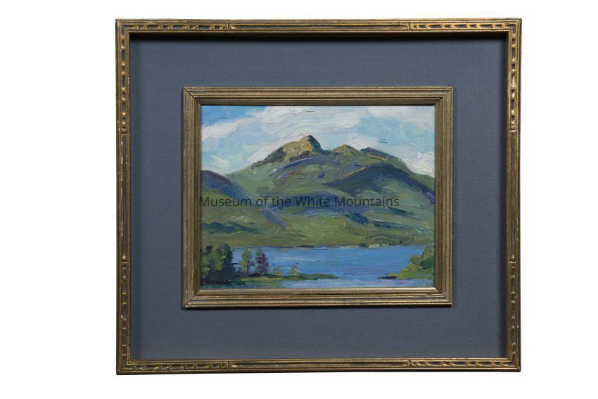 Landscape of Mount Chocorua looking across lake. Lake has some greenery in foreground. Mount Chocorua, and the surrounding mountains, are green from trees and shrubs.Artwork Details
