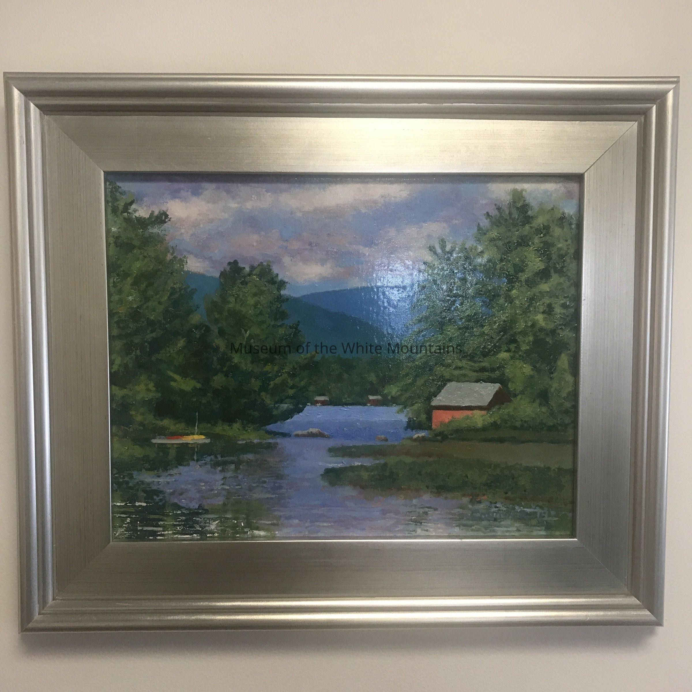 View of a small red bulding and sail boat in Piper Cover on Squam Lake.Acquisition