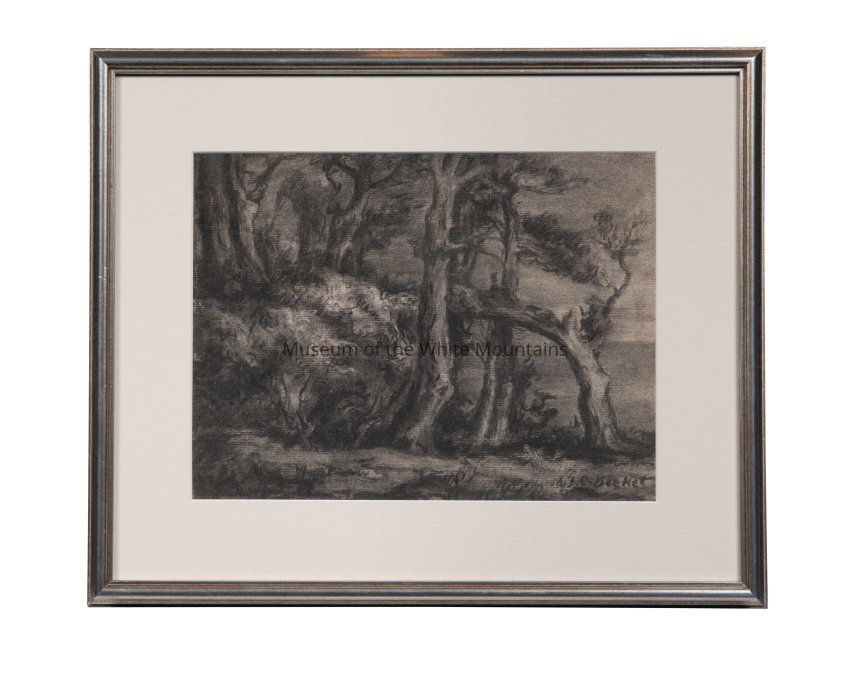 Charcoal drawing of trees and shrubs, appears to be swamp-like. Shrubs in the left foreground and trees in center and right foreground. A few of the trees appear to be dead.Collection