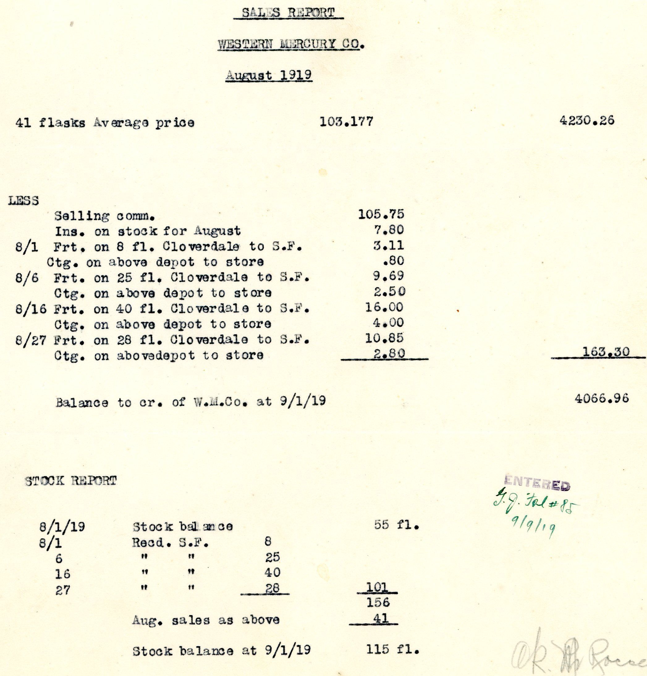 Sales report for the Western Mercury Co. dated August 1919. Lists 41 flasks of mercury sold at an average price of $103.177 for a gross of $4230.26. Deductions totaled to $163.30 for a net of $4066.96. The stock report lists they ended the month with 115 flasks in stock.Name/Title