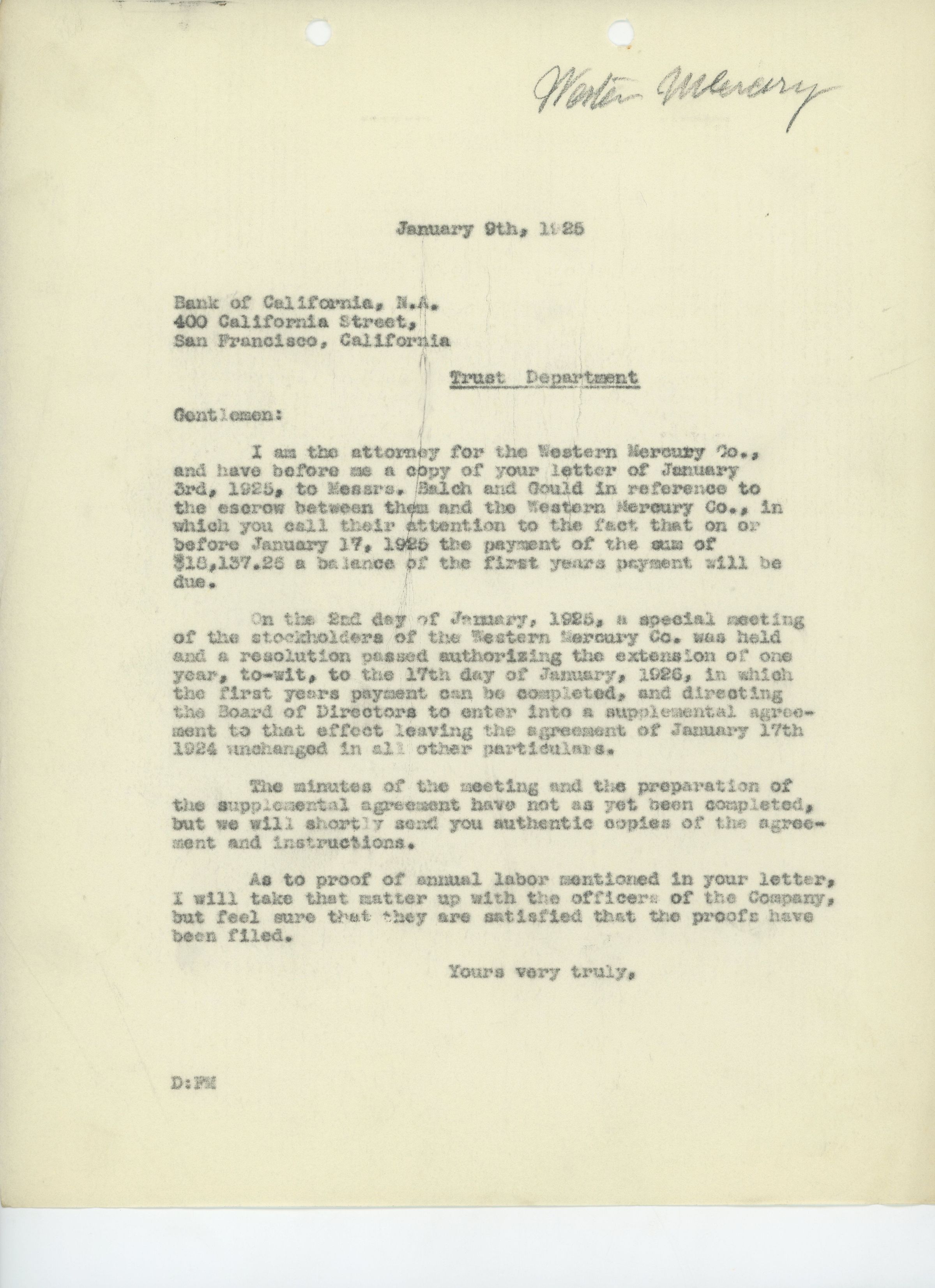 Unsigned letter to the Bank of California from the attorney of the Western Mercury Company regarding an extension granted to Balch and Gould on their escrow.
