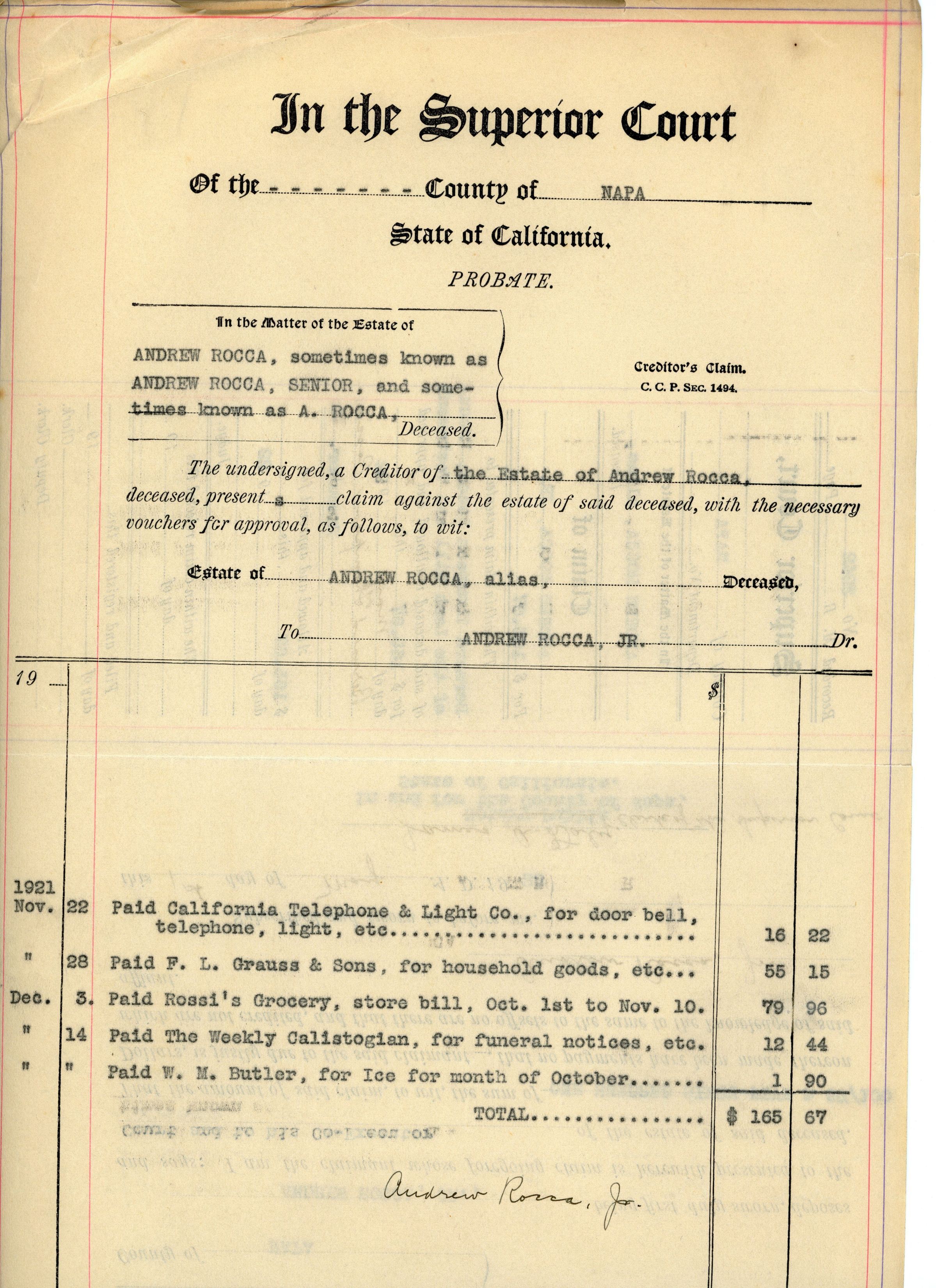 Court claim filed by Andrew Rocca, Jr., on May 1, 1922, in the Napa County court for reimbursements from the estate of Andrew Rocca, Sr., for expenses related to settling various accounts of Rocca, Sr. The expenses total to $165.67Name/Title