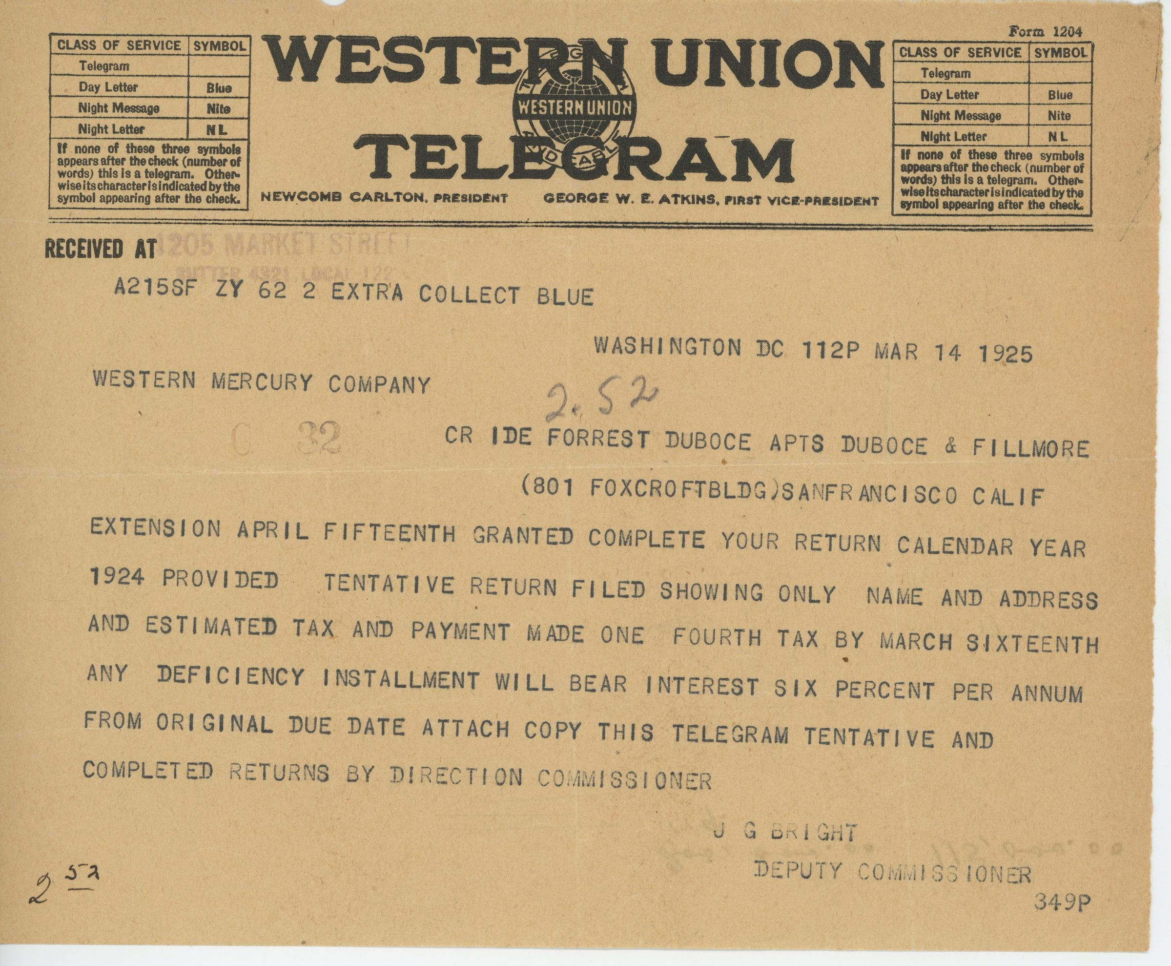 Telegram to J. G. DeForest from the Deputy Commissioner of the IRS granting an extension for filing the 1924 income tax return for the Western Mercury Co.