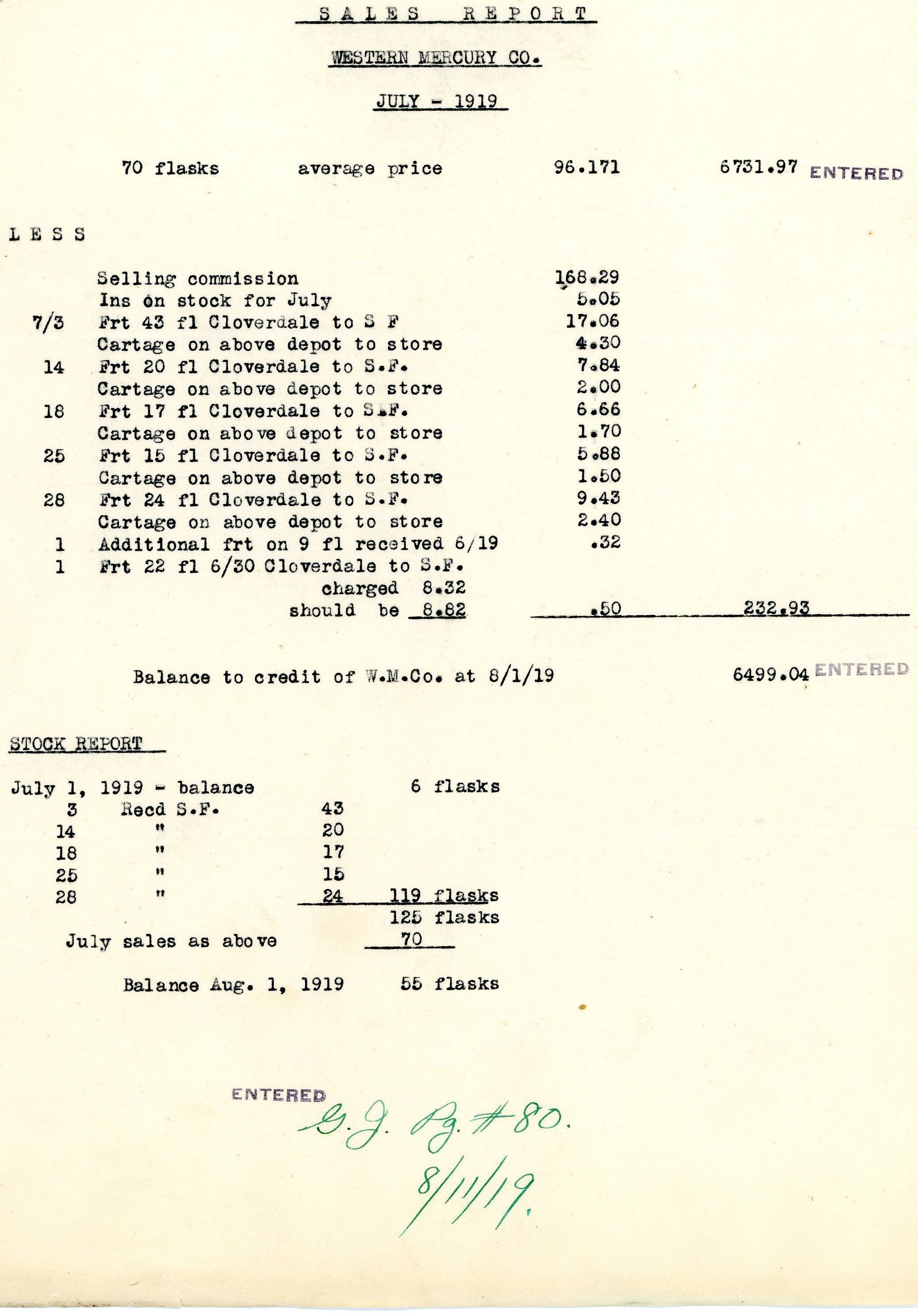 Sales report for the Western Mercury Co. dated July 1919. Lists 70 flasks of mercury sold at an average price of $96.171 for a gross of $6731.97. Deductions totaled to $232.93 for a net of $6499.04. The stock report lists they ended the month with 55 flasks in stock.Name/Title