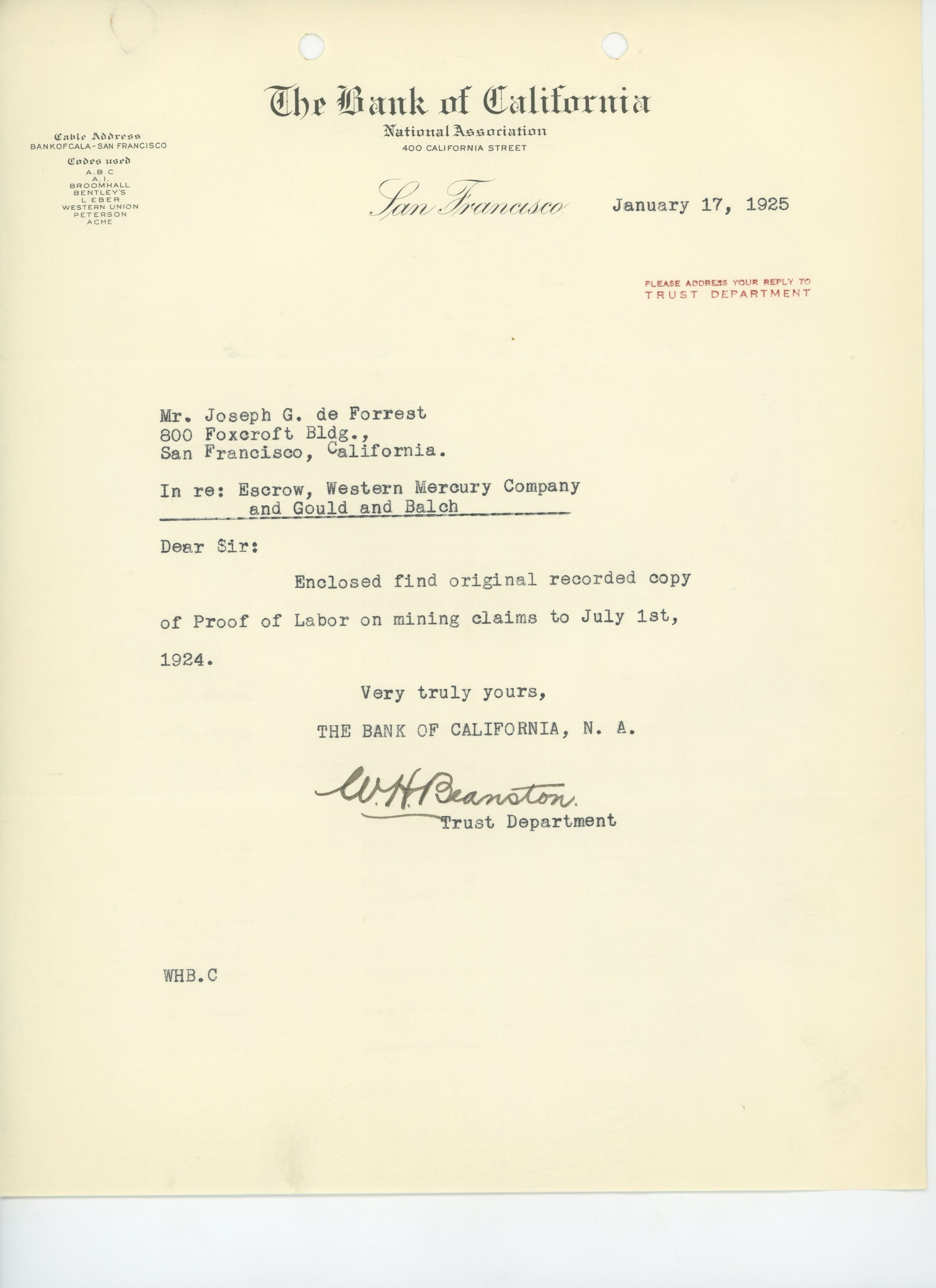 Letter to Joseph G. de Forest from the Bank of California regarding a Proof of Labor from July 1, 1924.