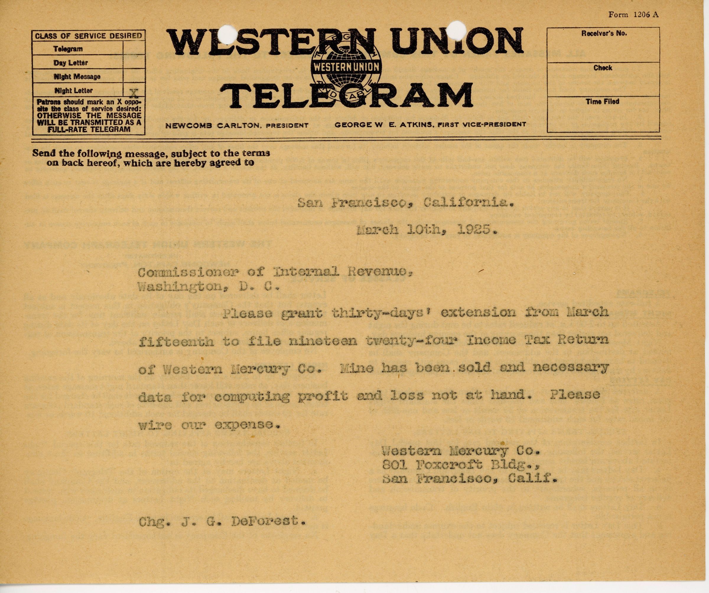 Telegram to the Commissioner of Internal Revenue from J. G. DeForest requesting a thirty-day extension for filing the 1924 income tax return for the Western Mercury Co. because a mine had been sold and the company needed more time to compile the necessary data.Name/Title