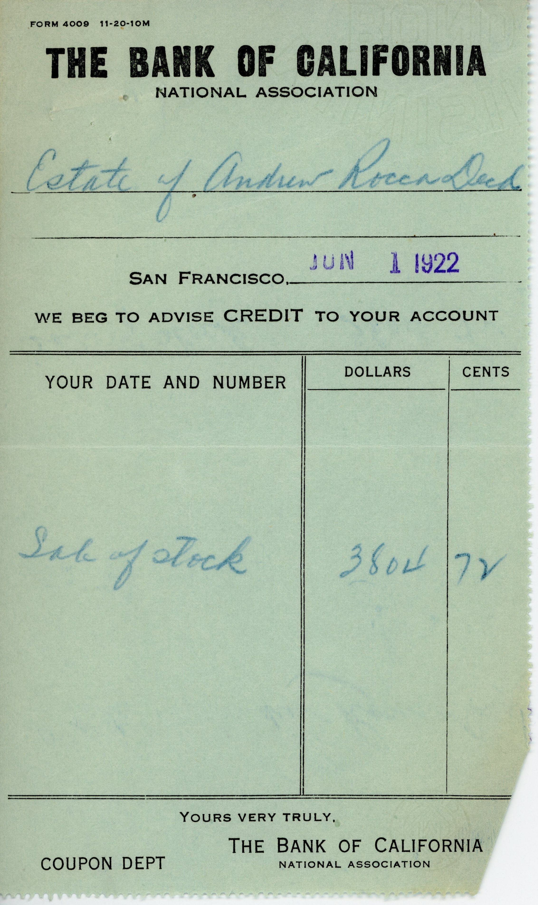 Bank slip from the Bank of California for the estate of Andrew Rocca, Sr., dated June 1, 1922, for sale of stock worth $3804.72.