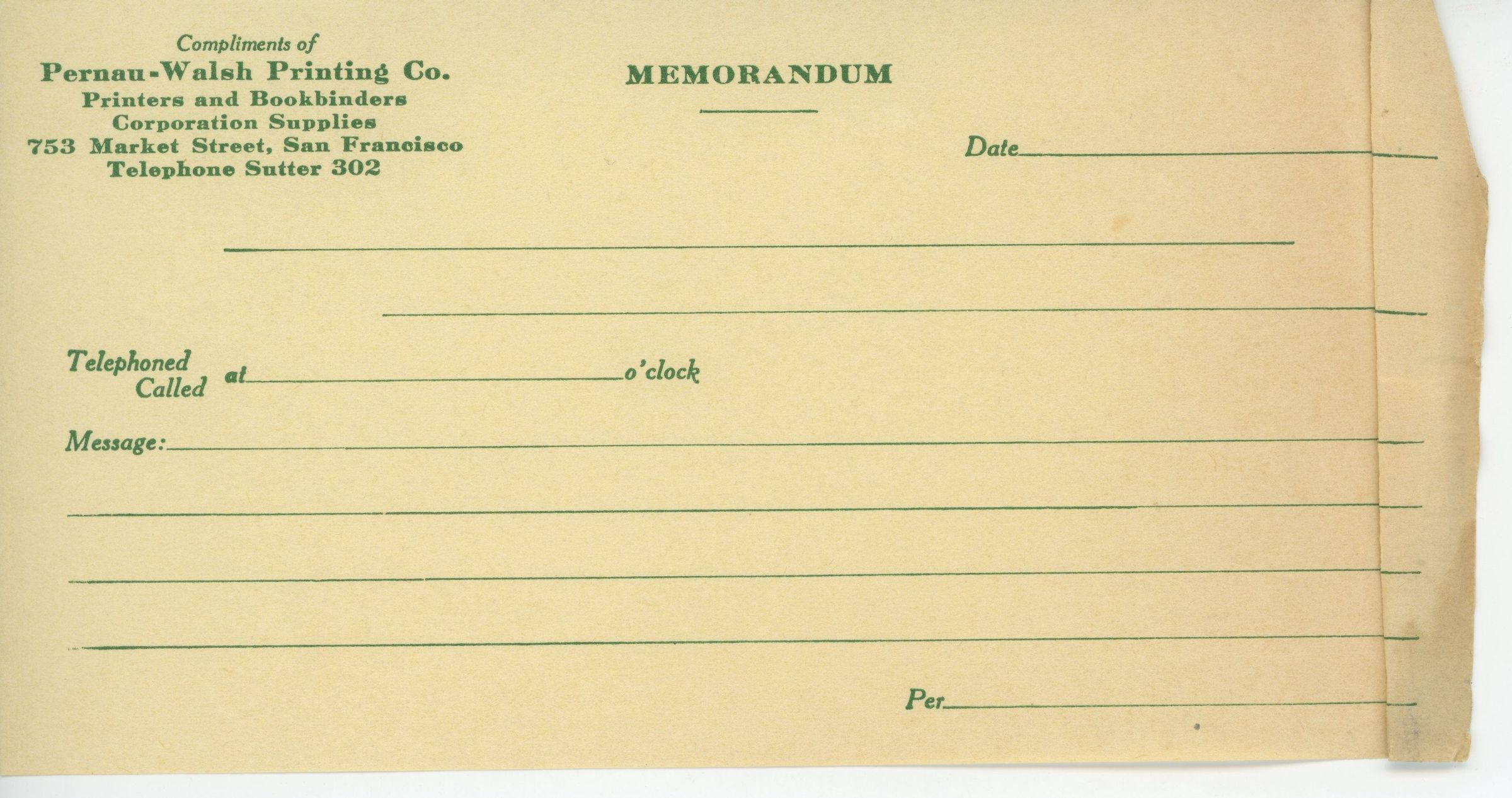 Blank memorandum form printed by the Pernau-Walsh Printing Co.