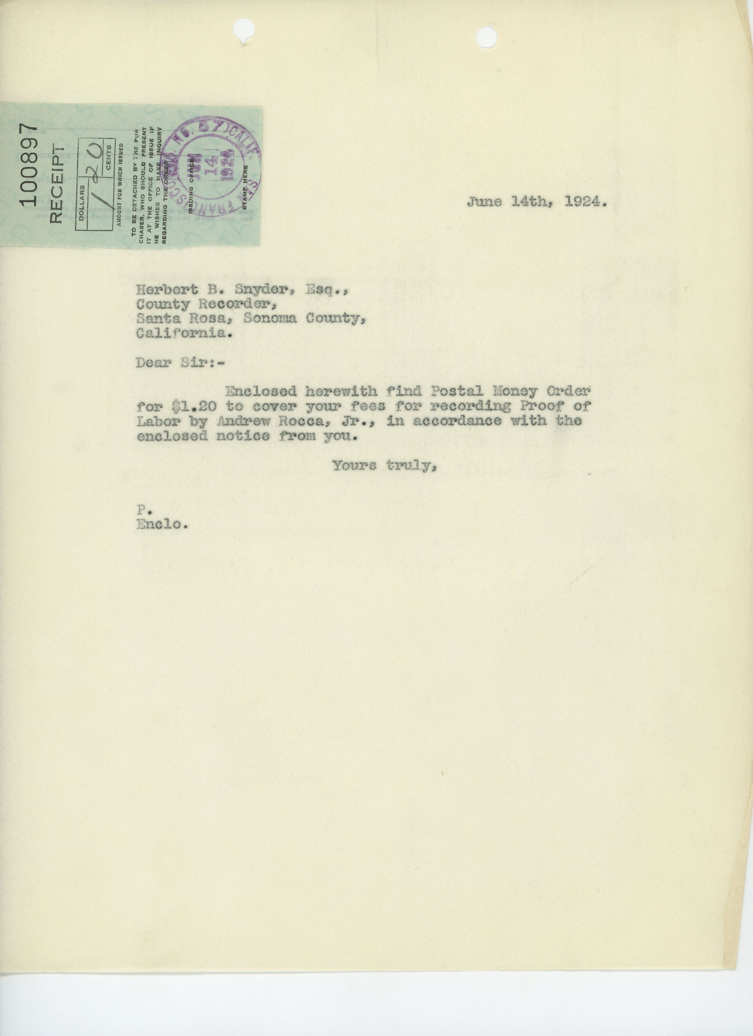Unsigned letter to Herbert B. Snyder, the Sonoma County Recorder, regarding a money order worth $1.20 for fees for recording a Proof of Labor for Andrew Rocca, Jr., with an attached blue receipt.