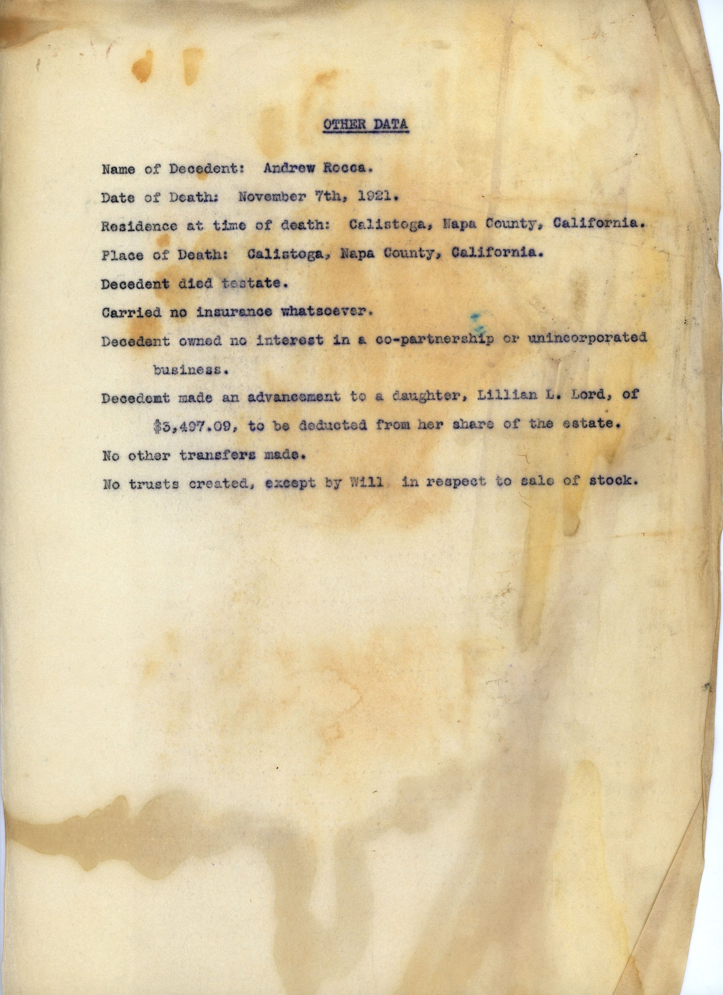 Typed note titled "Other Data" providing information on Andrew Rocca, Sr., at his time of death. States that he died on November 7, 1921, in Calistoga, carried no insurance, and gave an advance of $3497.09 to his daughter, Lillian L. Lord.Name/Title