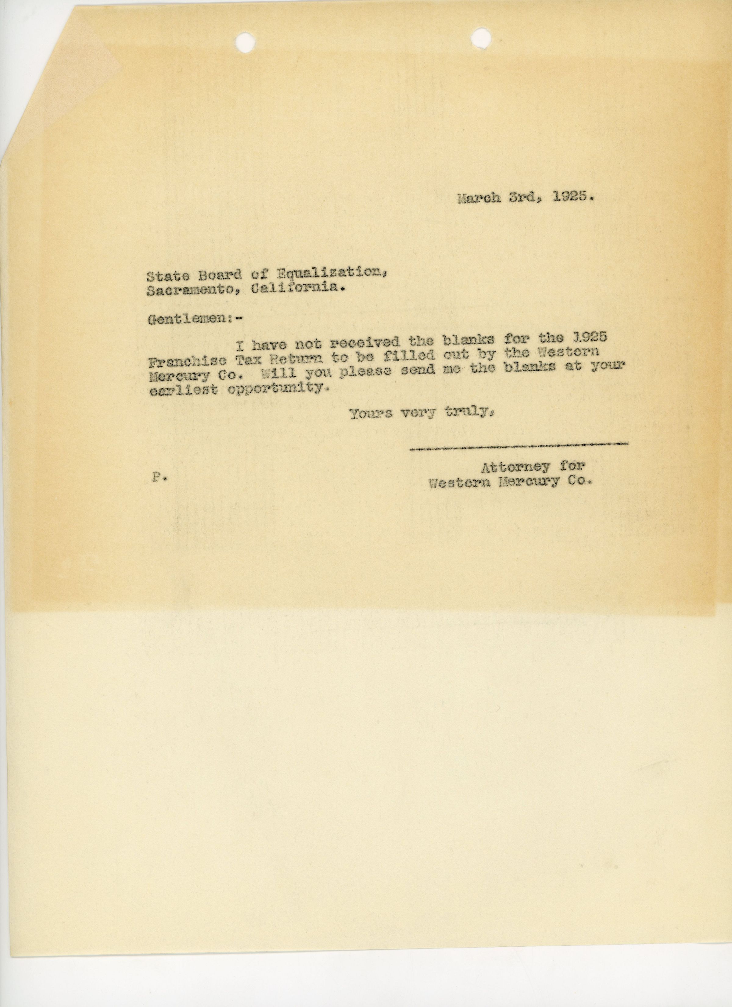 Unsigned letter to the State Board of Equalization from the Attorney for the Western Mercury Co. requesting blanks for the 1925 Franchise Tax Return.