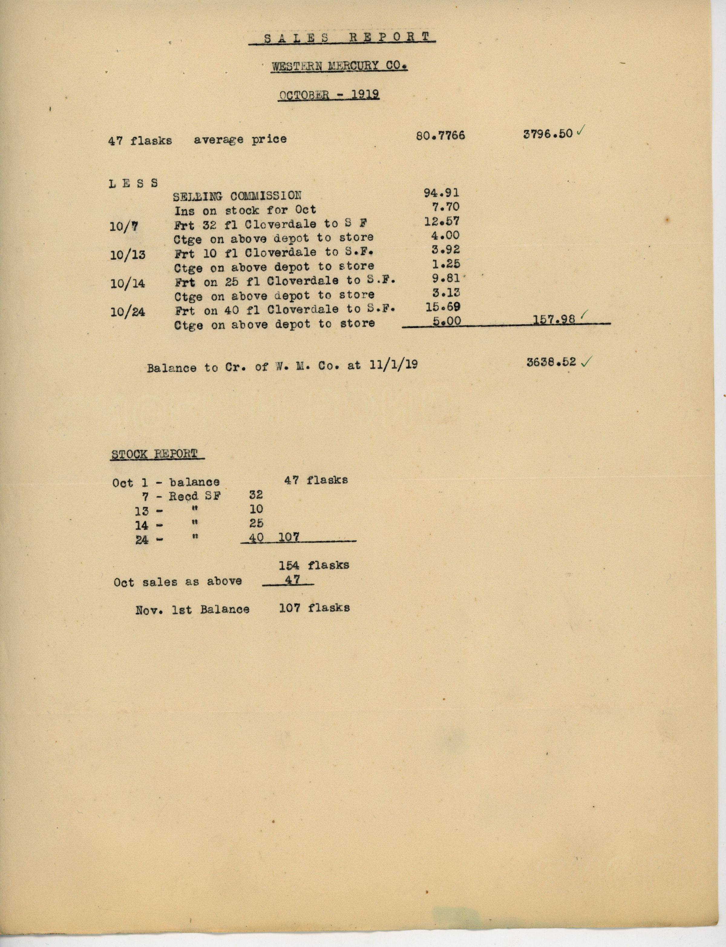 Sales report for the Western Mercury Co. dated October 1919. Lists 47 flasks of mercury sold at an average price of $80.7766 for a gross of $3796.50. Deductions totaled to $157.98 for a net of $3638.52. The stock report lists they ended the month with 107 flasks in stock.Name/Title