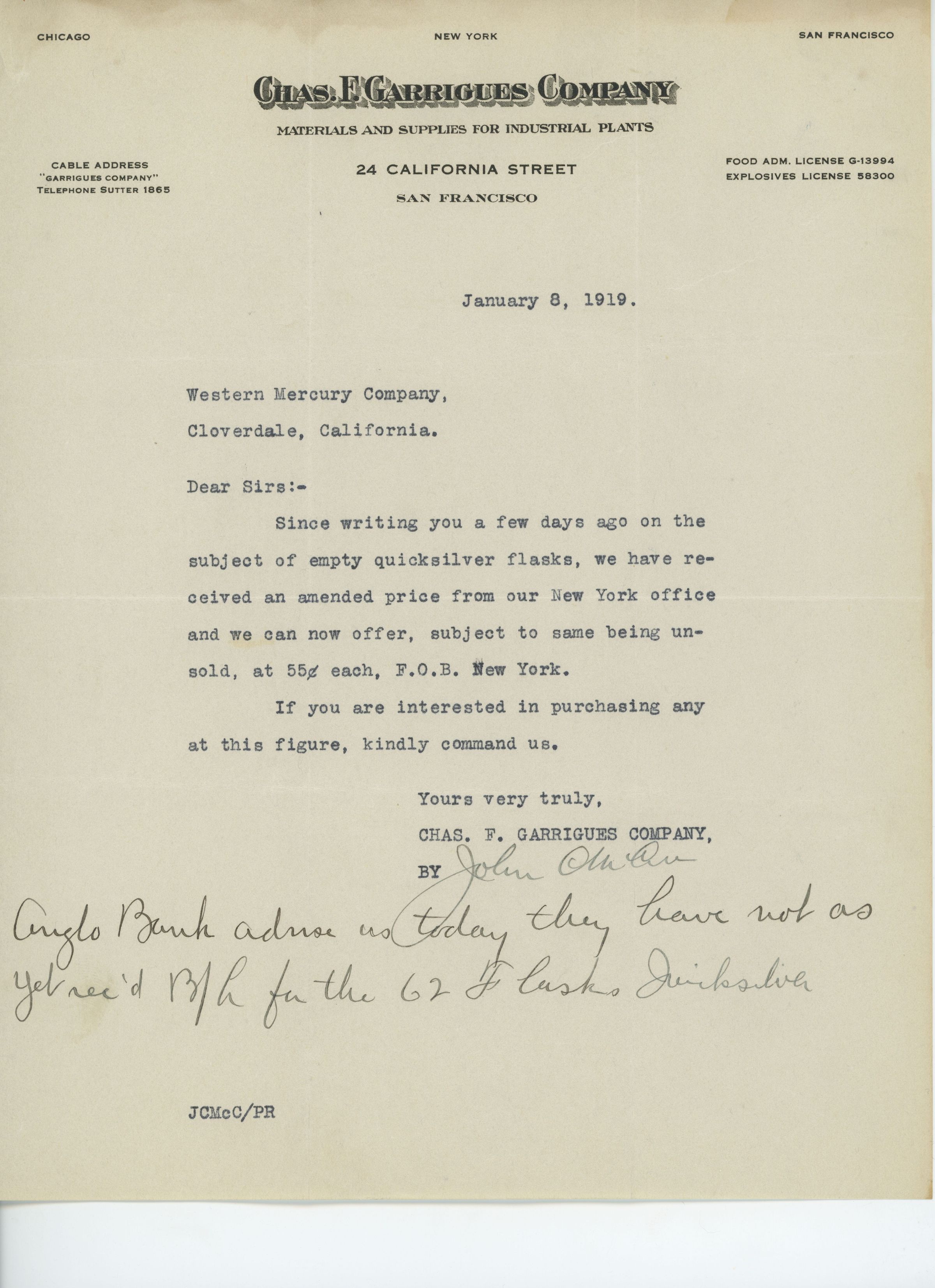 This document is correspondence between Chas. F. Garrigues Company and the Great Western Mine Company based in Cloverdale, California. The content is in regards to the G.W.M. purchasing back empty quicksilver flasks at a cost of 55 cents a flask. If they want to than the Chas. F. Garrigues Company will set it up with their New York office.Name/Title