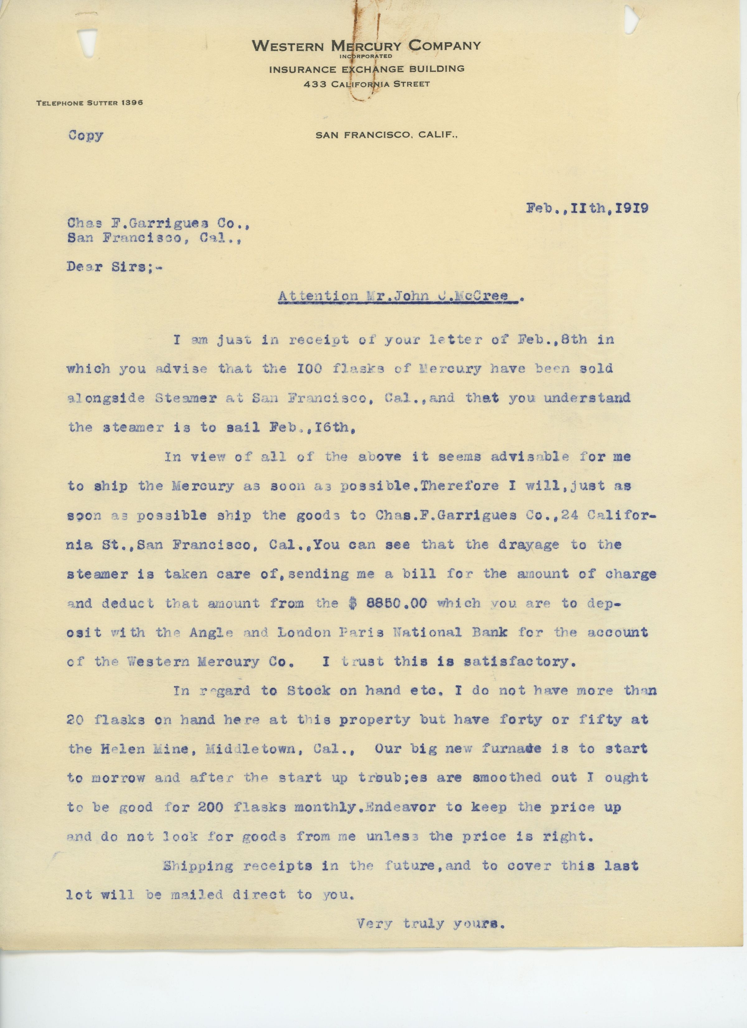 This is a letter/business correspondence from the Great Western Mining Company to the Chas. F. Garrigues Company in regards to shipping out flasks of mercury to them and what amount of money they can take out of their future payments to the G.W.M. in light of these shipments. It further informs them of how much business can be done once the furnace at the Helen Mine in Middletown is up and running, and once all the troubles are smoothed out. The G.W.M. predicts a reliable shipment of up to 200 flasks monthly as long as the "price is right."Name/Title