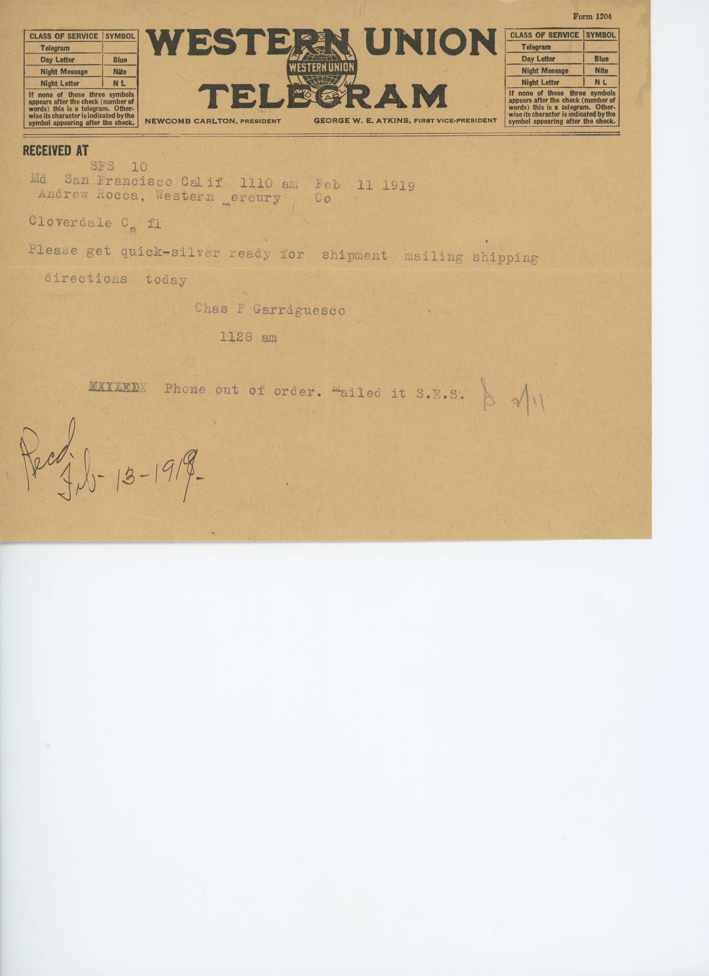 This telegram was sent from Chas. F. Garriguesco to Andrew Rocca of the Great Western Mercury Mine on Feb. 11, 1919 at 11:10am. This telegram is asking that all quicksilver should be prepared and readied for shipment and that directions for shipping will be mailed out that same day.Name/Title
