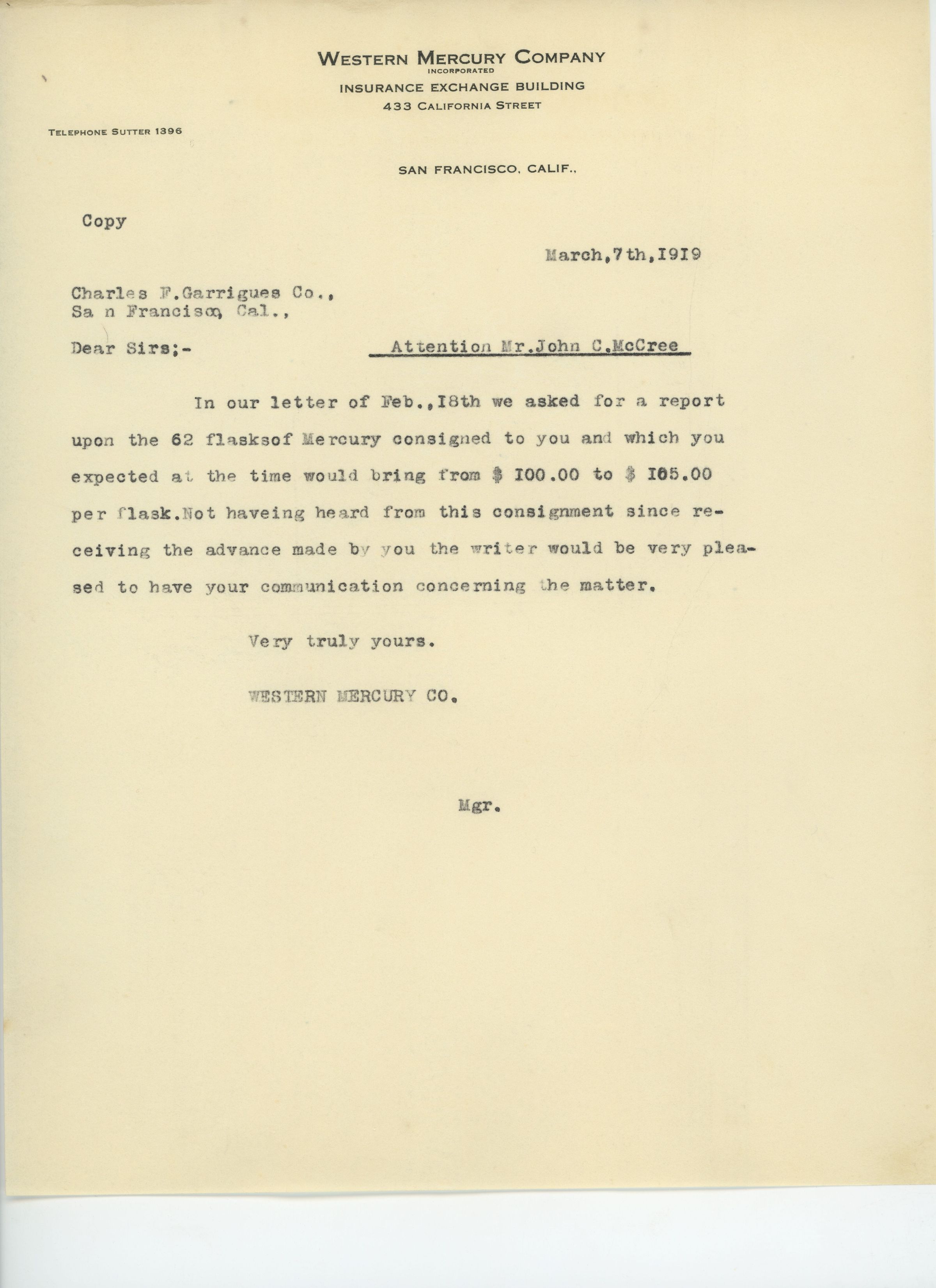 This document is from the Western Mercury Company to a Mr. John C. McCree and is in regards to recieving word back on a report for a consignment order of 62 flasks. They were quoted that they would bring between $100.00 to $165.00 per flask.Name/Title