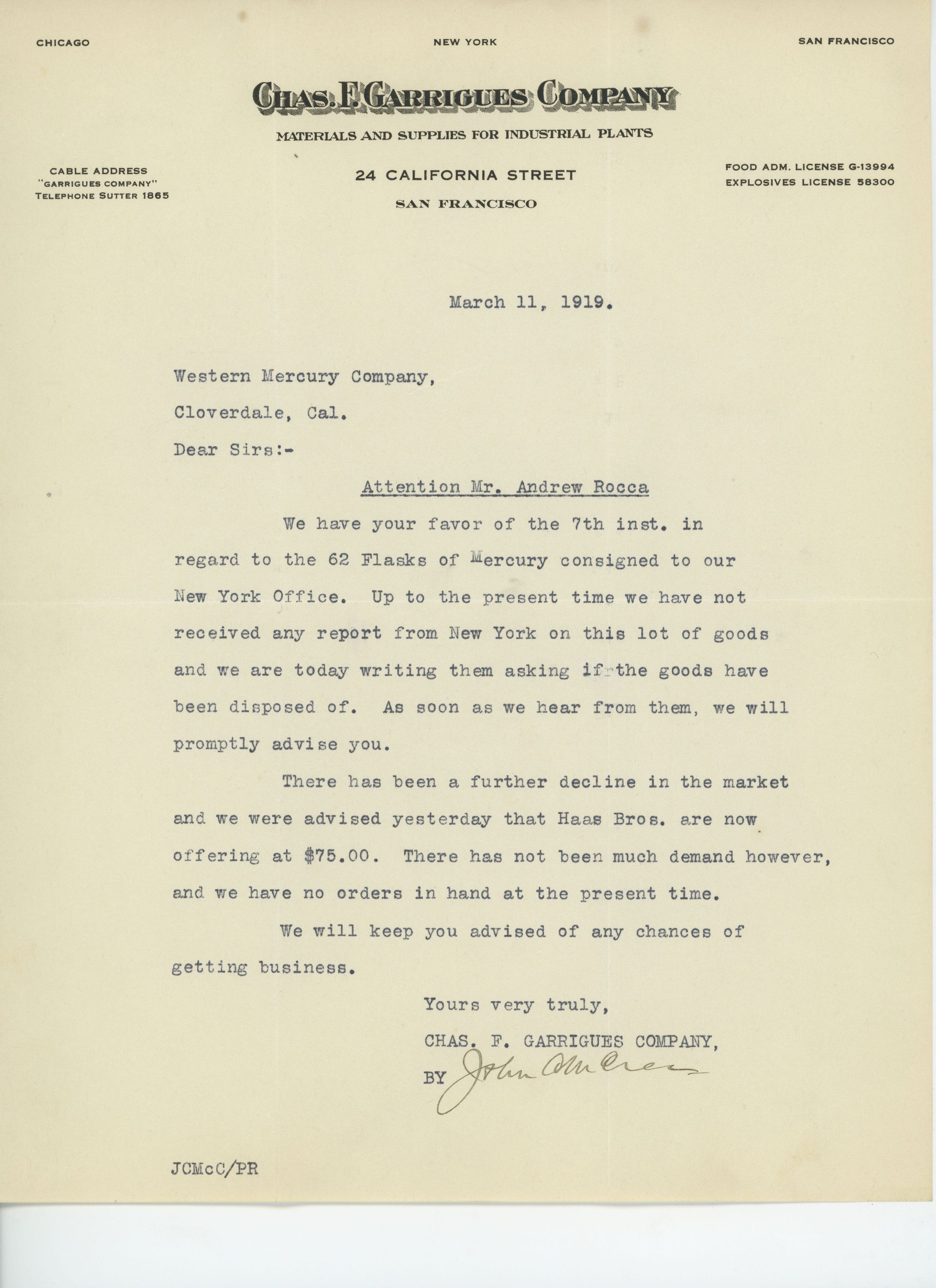 This document is to the Western Mercury Company from Chas. F. Garrigues and is in regards to the 62 flasks of Mercury that were consigned to the New York office. The document states that they have not recieved any additional information regarding the product. The end of the document is talking about the drop in demand and the drop in prices which can be seen in the $75.00 charge of the Haas Bro. Company per flask. Future correspondence on recieving business is expected to follow.Name/Title