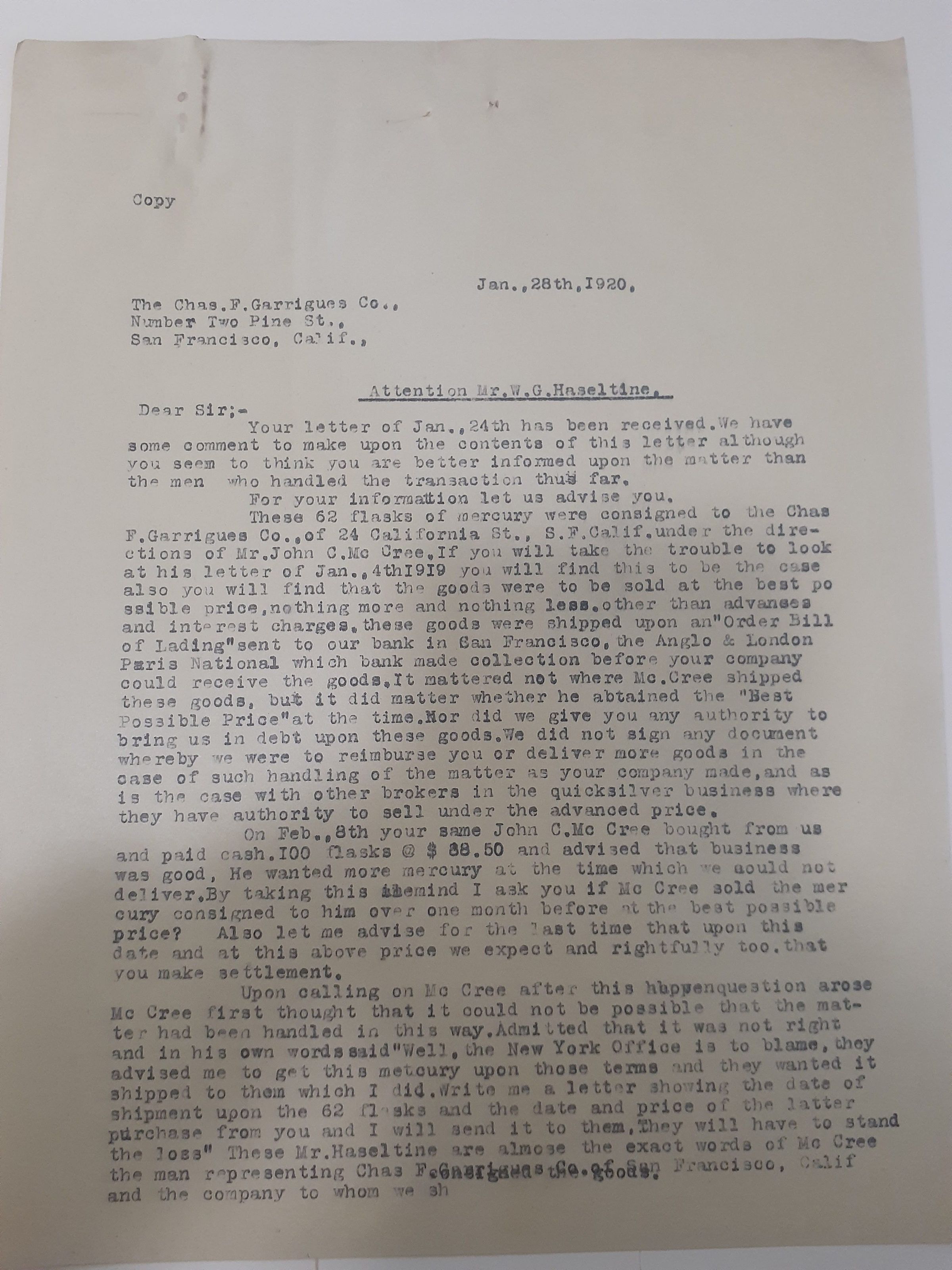 (Two Page Document). This document is a response from the Western Mercury Co. Inc. to the Chas. F. Garrigues Co. in response to the believed outstanding debt that they owe on their account. They are very sure they do not owe any money and are fighting the idea that through some fault of their own they owe money to the Chas. F. Garrigues Co.Name/Title