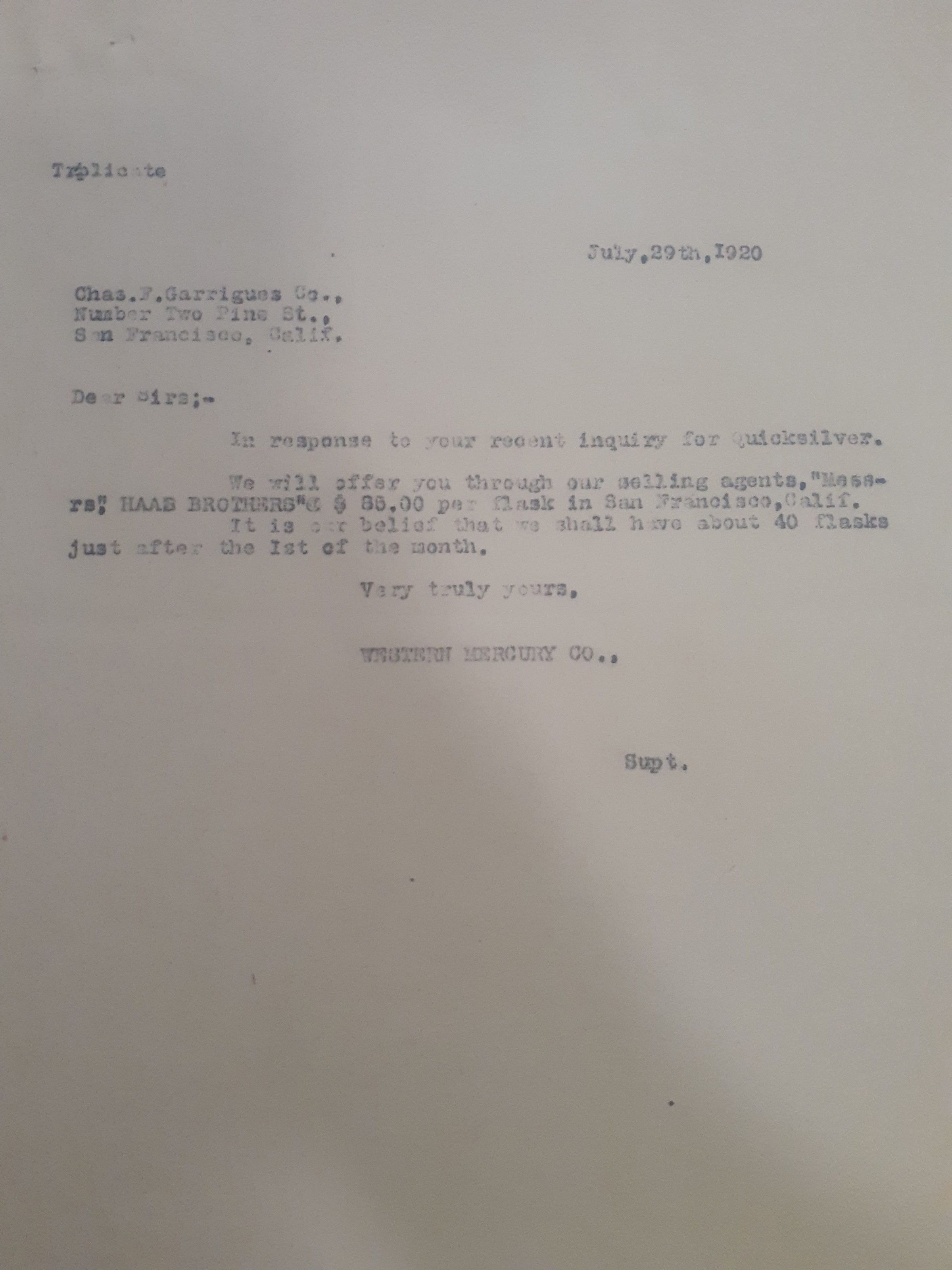 This document is from Western Mercury Co. to the Chas. F. Garrigues Co. and they are informing them that they can sell approximately 40 flasks at the end of the month for 85.00 per flask.