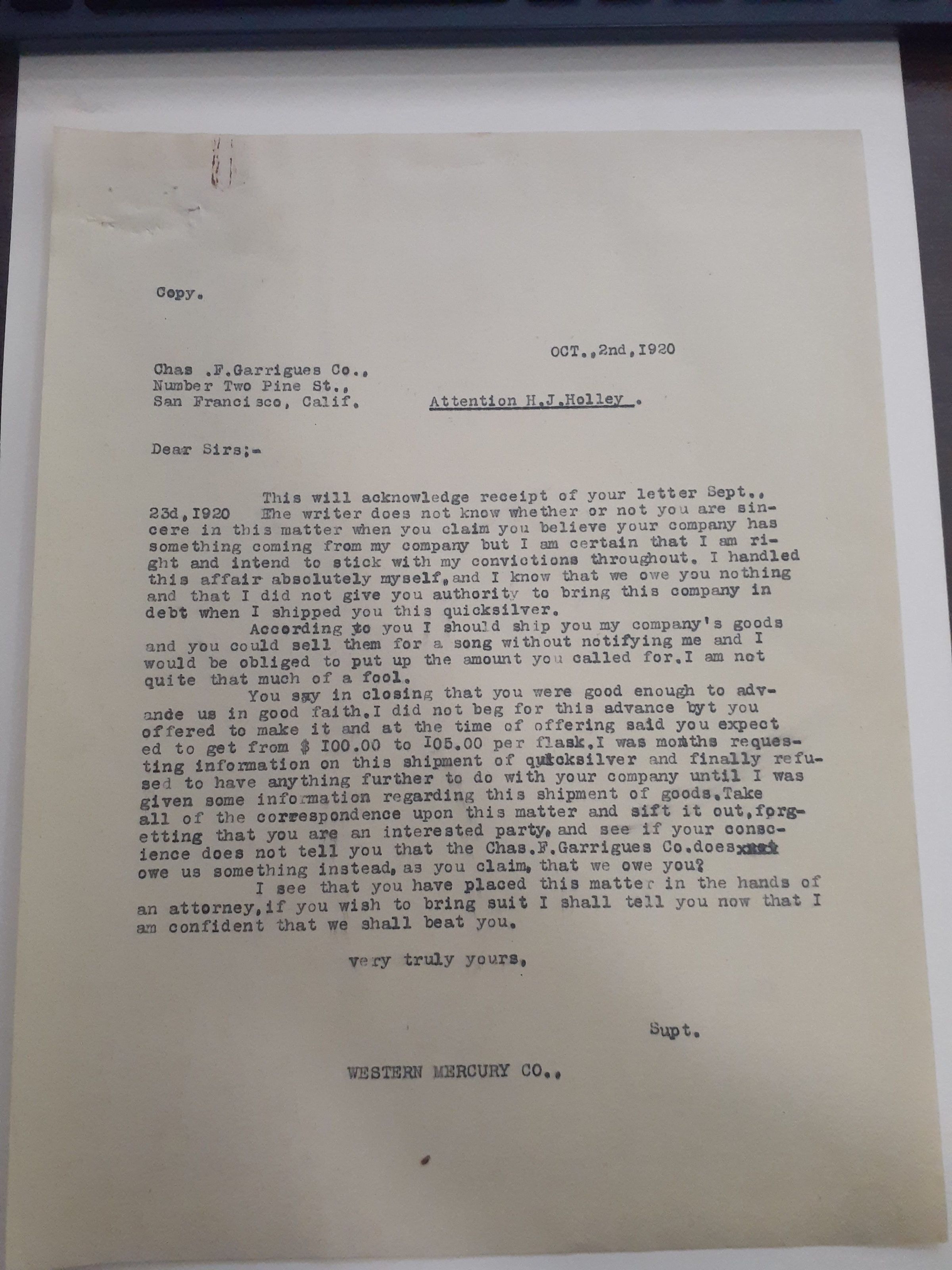This document is to H.J. Holley of the Chas. F. Garrigues Co. from the western Mercury Co. It is again another response in the long correspondence between these two companies regarding the outstanding balance on the Western Mercury Co.'s account. Again the representative for the W.M. Co. is certain that they owe no amount of money in regards to the 62 flasks of mercury taken on consignment in 1919. He is sure that the Chas. F. Garrigues Co. is responsible for their own debt because they are the ones who sold below market value at a loss. He furthermore acknowledges that an attorney has been hired by C.F.G. Co. and that he is prepared to go to court with this matter.