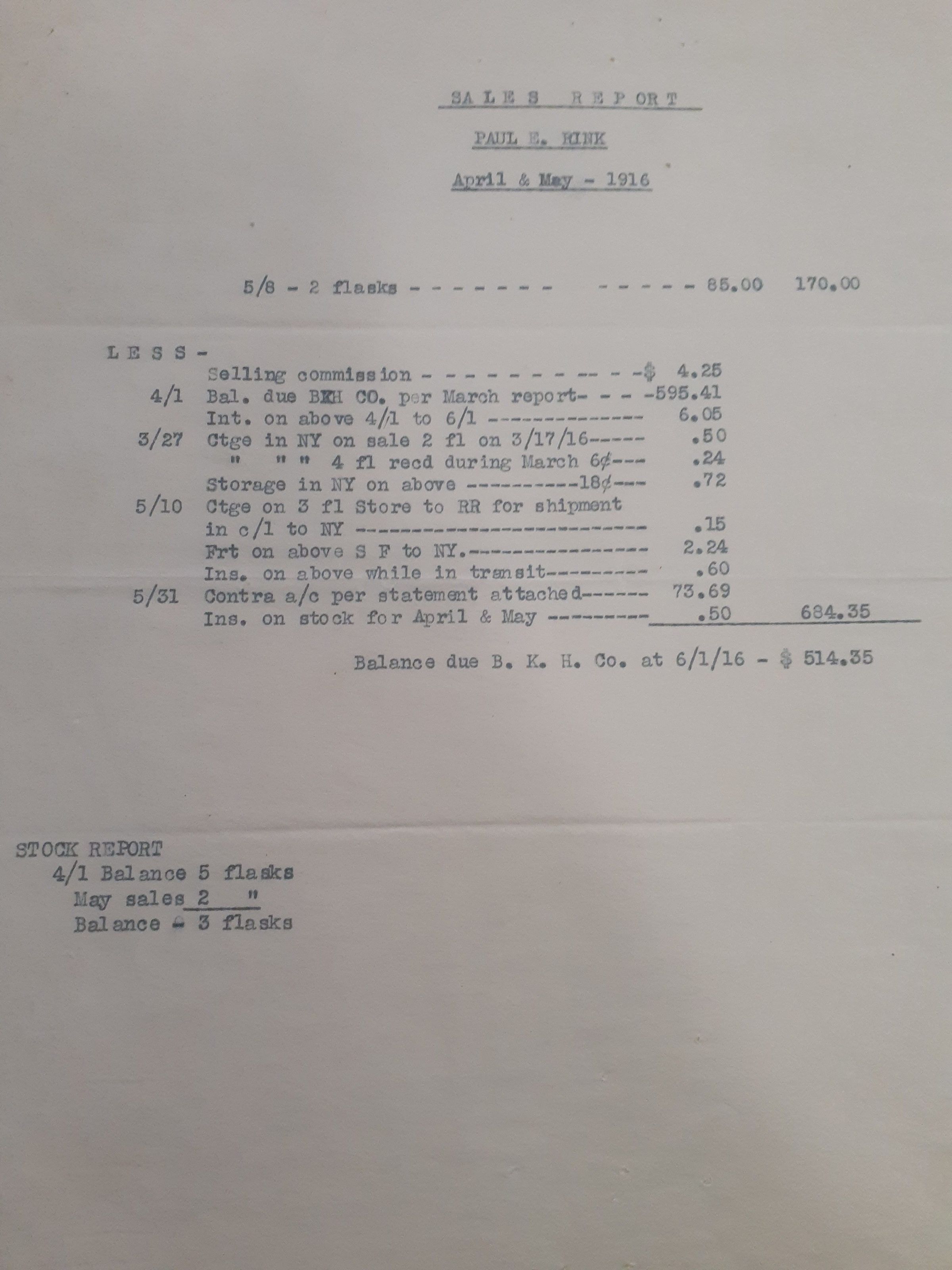 This document is an invoice/sales report for the months of April and May, 1916, for the B.K.H. Co. Name at the top of the page is Paul E. Rink.