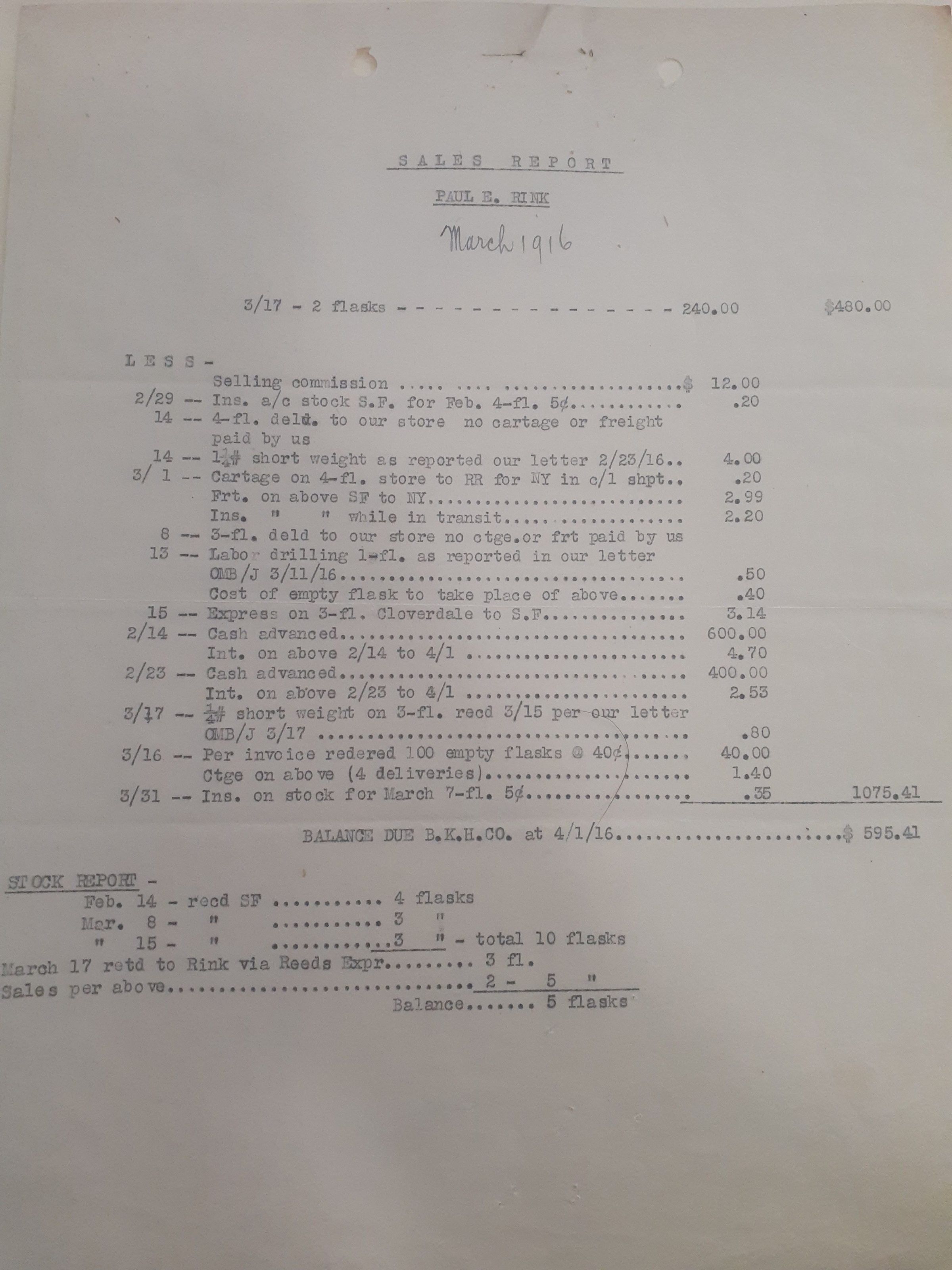 This document is a sales report for the month of March, 1916, with the name Paul E. Rink at the top.