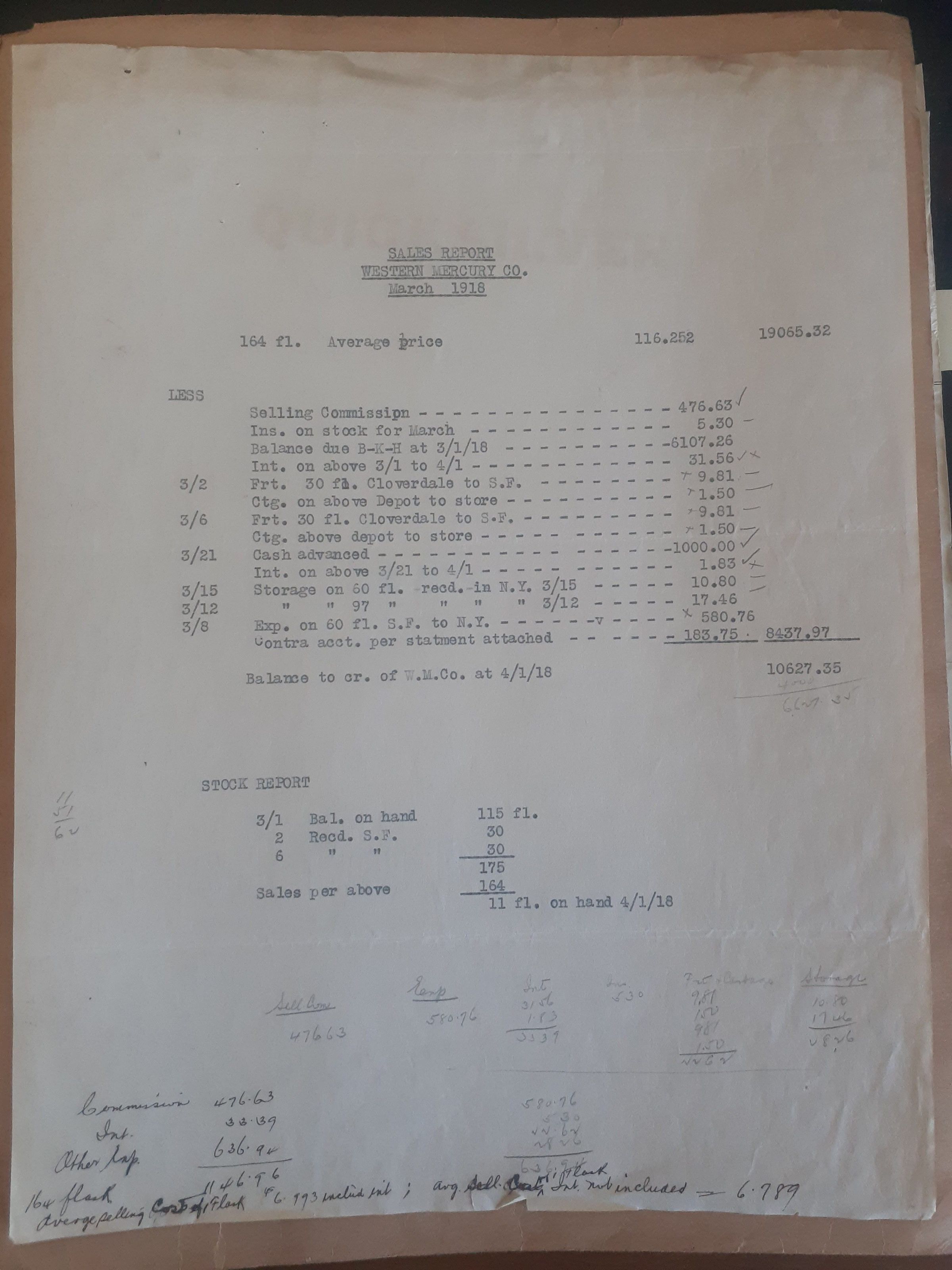 This document is a sales report for the Western Mercury Co. for the month of March, 1918. The balance owed by the W.M. Co. at 4/1/18 is $10,627.